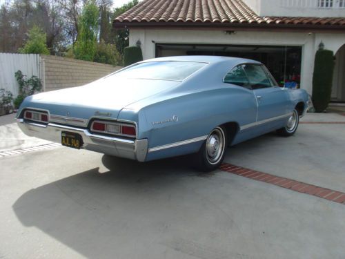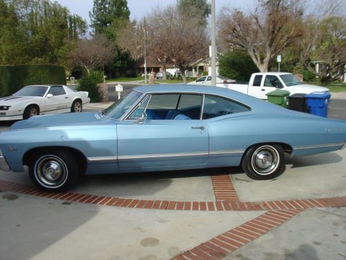 Up for sale today is an all original ONE OWNER rust free NUMBERS MATCHING 1967 Chevy Impala 396 BIG BLOCK with 98k original miles. This car is a one owner all original car with the black CA plates and was built here at the Los Angeles plant with the L in the vin #, the interior is all factory original and is in excellent condition, no rips no tears no nothing. All original from the carpet to the headliner. Car still has the factory original Blue paint on it, never been repainted so its all metal, paint has typical chips and scratches and some 50 year old patina on it, the hood has some checkering going on in the paint. New tires on this car also. Undercarriage and trunk are in excellent shape too no rust. Car still has the original Numbers Matching 396 Big Block engine that runs like a dream, super smooth, fires right up even when the car has sat for several days and runs real quiet, no shaking, no smoke, no exhast leaks. Just an excellent running car also has power steering also. All lights and guages work on the car as well. Hard to find them like this anymore untouched and original. This 67 also has a rare option with the rear window defrosters. Car has the all the original paperwork with it including the protect o plate and original manuals. Car is being sold As-Is with no warranty and is the buyers responsibilty to check car prior to bidding. Car is Located in Los Angeles and has a clean title in hand. I have sold a couple cars to overseas buyers and out of state buyers in the past and can offer to deliver the car to any of the shipping companys here in southern california or can give you the numbers to a few shipping companys ive used many times with no issues. Most of my cars end up selling before the auctions even end so i have the right to end the auction early if the car sells locally.