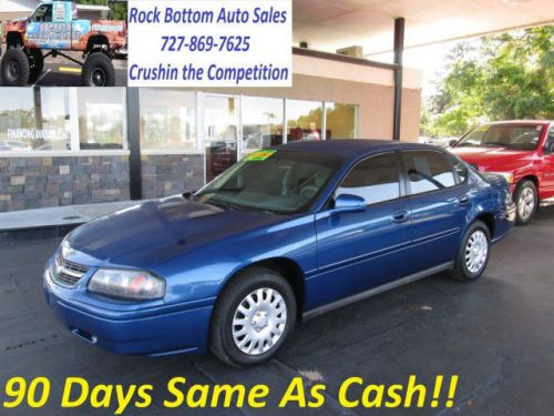This American classic looks great with its new image!! 2005 Chevy Impala at an affordable price!! Dark blue paint and soft gray interior show like new!! Peppy V6 with plenty of power and a smooth shifting automatic transmission!! Roomy interior fits five adults comfortably!! Spacious trunk with fold down rear seats allows for extra cargo space!! loaded with power windows, locks and mirrors, cruise control, tilt wheel, cd audio, ice cold AC!! All for only $4999!! CALL FOR APPOINTMENT 888-510-7708 ROCK BOTTOM AUTO SALES 11643 STATE ROAD 52 HUDSON FL 34669 $750.00 DOWN DELIVERS MOST CARS TRUCKS SUV'S W.A.C. CALL FOR DETAILS VISIT OUR WEBPAGE TO SEE ALL INVENTORY