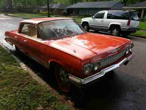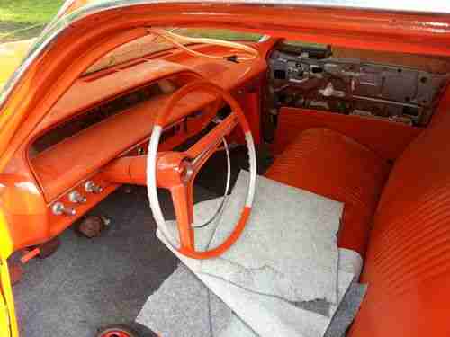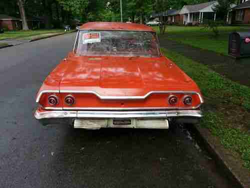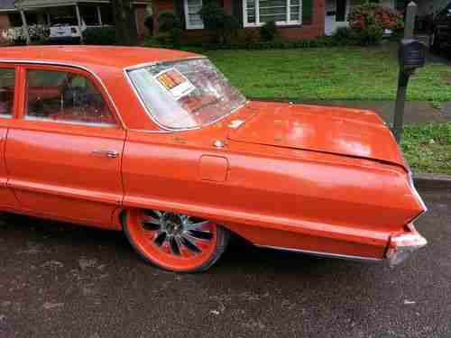 Very Nice 1963 Chevy Biscayne Project Car. This car comes with a 2 speed power glide transmission, and a drive shaft. Its painted pearl orange with 24 inch chrome and powder coated orange 24 inch rims. All the rims are good except for one, it will need to be repaired or replaced. The Car has a solid body with 85% of the body work done. The car needs trunk pans, and New glass on the passenger front, the rest of the glass is intact but have small cracks or scratches from old age. The trunk lid will need some work on it from a small dent. The car did have a 350 engine in it, there is no motor, this car is a V8 car. You can a drop a engine in and go! The interior is very clean and intact almost 90% complete. I relisted car due to a stop auction bid. If you have zero feedback I have the right to end your bid. I've tried to describe car as best i can. ASK questions if needed. Buyer pays for shipping. Deposit within 48 hrs.