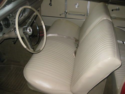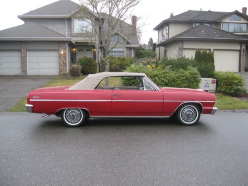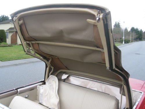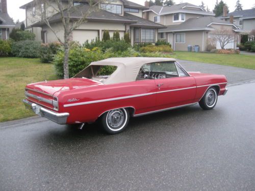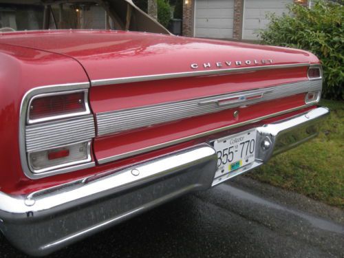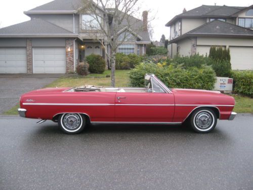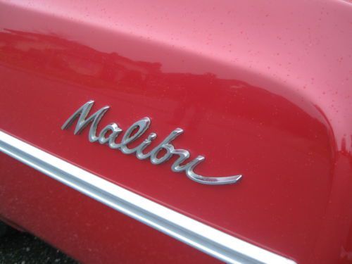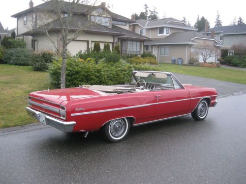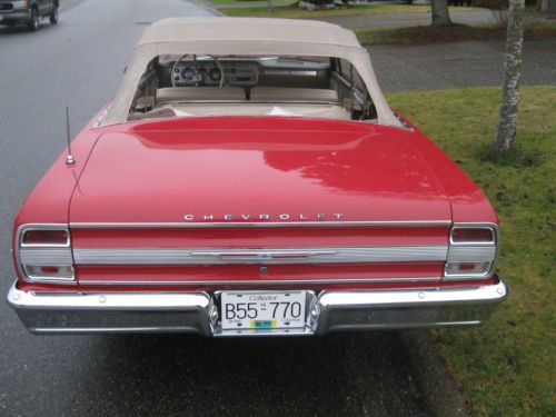 Nice clean 1964 Chevrolet Malibu convertible,two owners since bought new in Vernon BC,dry climate car always stored indoors and senior owned and cared for. Car was off frame 6 years ago and frame was cleaned and painted and looks as new zero rust issues,new body bushings,under side of car also painted at this time,one repaint on factory Red exterior car,under carpets and iside trunk floors also painted body color.New rubber producst on trunk and doors and roof,5 year old interior to factory correct and new top both Tan in color,plastic rear window zips open.new radial tires on stock restored rims with SS caps ont he car now also have perfect condition stock hubcaps.New carpet kit,dash perfect with stock working guages and radio and heater,electric wipers new blades,glass all very good with small crack on wind shield 'but comes with brand new NOS tinted wind shield included" all side glass very good and windows work as they should,updated front disc brake with new style double master and new style booster,factory power steering car drives very good,stock rear end with new seals,new dual exhaust and mufflers,new shocks,recent trunk mat and under pad,spare and jack and all manuals included,California car cover,some extra fender emblems included as well, factory V8 car with 350CI short block 4 bolt mains dressed like stock 327CI, Automatic column shift transmission.new radiator,stainless good condition and bumpers rechromed and nice shape.Peppy little Bow-Tie Convertible can help with shipping from this end World wide,the car is for sale locally and I reserve the right to end the auction early if sold ,will not end auction if reserve has been met.Many other Muscle cars and streetrods coming soon to Ebay ,email me for the link to view them all.This Malibu convertible is priced to sell.