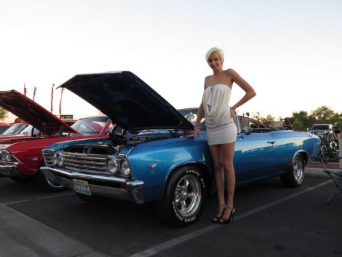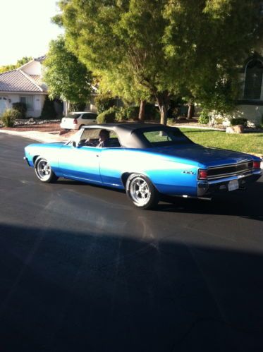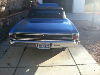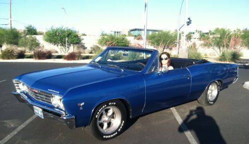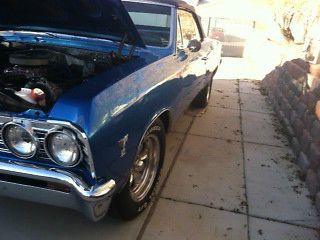 We have a numbers matching 1967 Chevelle Malibu up for auction. We are the 3rd owners of the car.Rating from 1-10 10 being perfect i would rate it a 7. It is not a trailer Queen but a really nice car! The car was sold in Las Vegas Nevada and driven to colorado for several years then back to Las Vegas again where it has been every since. In the time that the car sit in Denver Colorado covered up it began to rust. When I bought the car from the second owner "here in Las Vegas" He had the Quarter panels and floors Replaced by a local body shop. They also shaved the firewall for vintage air before I had purchased it so I don't have the heater box, I do have the interior gages though. Other than that to my recollection it is all original. The original 283 V8 motor has about 300 miles since the rebuild and runs strong it also has the factory 350 Auto trans. that has been rebuilt, original drive shaft, 10 bolt non-posi rear end. I have the original exhaust manifolds on it but has after market Edelbrock 600cfm carb. and intake on it. "I don't have the originals." The car is very solid! nice paint.Color is Pacifica Blue with a black top and has a Glass window the original color was a butternut yellow with a black top with a plastic window. I don't have the original steering wheel, or the rims. The wheels are torque thrust wheels with 15" tires. Flow master dual exhaust sounds really good.The car drives really nice. I don't have the Kick down lever and bracket hooked up to the transmission yet but i do have it. The car has disc brakes in the front and drums in the rear. The seats are all original and have a small tear in the back corner of the front bench seat. front door panels aftermarket, dash all original with non working clock,radio is in but no wiring to see if it works.I was going to put a power top on it. It has a manual top. That is the way it came from the factory. Top is Less than a month old so it is still a bit stiff. rear bumper has a little surface rust behind the plate but is original. Original grill parts, T3 headlights,bumpers, all lamps and bezels,radiator, and convertible trim."convertible trim has some small dents and dings in them." The under carriage has been sprayed with rubberized undercoat and all body mounts and bushings have been replaced. If your looking for a great, head turning classic Chevelle to drive around town. you've found it! Everywhere we drive the car people drool all over it!:) If you have any more questions please feel free thanks.(702) 366-5342