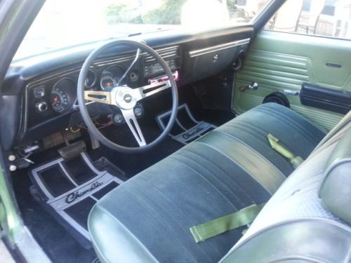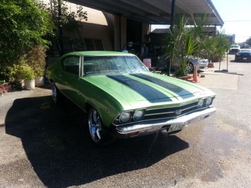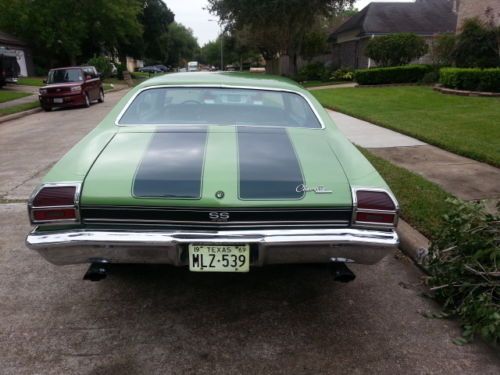 1969 Chevelle Malibu Clone SS396 " Head-turner" retro mod Mileage 55280-350 Engine V8 5.7 Voodoo cam (mild) With Flowmasters chrome headers. The sound is great and aggressive TH350 transmission, Chrome bell housing. 20 inch Boss wheels ( 20 x 8.5 - 20 x 10) offset with Toyo Proxes 4 tires,3 inch lip wheels drives straight steering at 12 o'clock ride is smooth Great Driver. Pioneer System with blue tooth digital with phone intergrade through speakers and mic for hands free driving, OEM interior green panels original, exterior is moss green base coat clear coat repainted in September 2013 clear coat base coat Stripes Base Coat clear coat Metalic Green. Edelbrock 600 cfm carb chrome headers with Chevy Inginia tail pipes. New Three point Steering Wheel , new dash, new dash pad, new headliner, body is laser straight, Headturner. Clear title. $500 Dollar deposit within 24 hours of end of auction. Cashiers check, Bank Wire or Cash within 4 days of winning auction buyer arranges shipping.