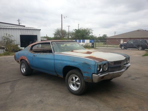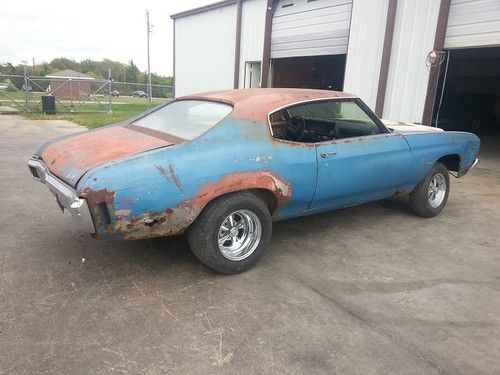 Factory blue w blue interior, great color combination, complete body w title, rolling with drum brakes all around, 10 bolt rear end (missing center chunk), good doors, good roof, fenders have chevy rust on bottoms, needs rear quarter skins, good floors, good rocker panels, good SS hood, trunk area has minimal very minimal rust, 15x7 Cragar fronts / 15x10 Cragar rear, in my opinion this 70 Chevelle NEEDS to be cloned as SS 454 car blue w blue bucket interior WOW! any more pics or questions call 501-779-5277