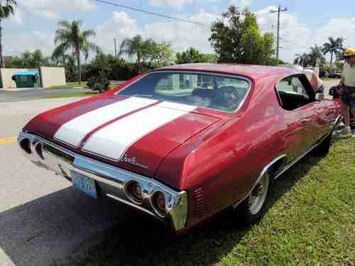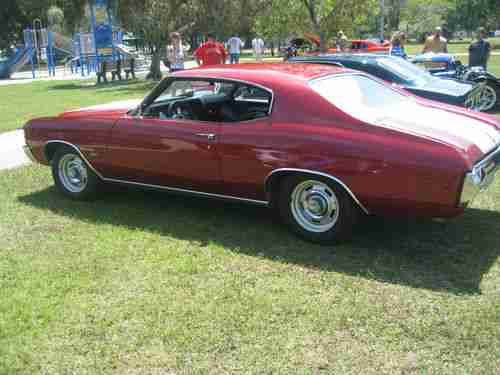 71 Chevelle Malibu 400 sbc, 400 cam, world product heads, alum intake, holey carb, hooker headers, built turbo 350 trans, shift kit, safety drive shaft, loop 12 posi rear with 373 flow master mufflers, new water pump. New cranberry red paint, black inside, good chrome, runs and drives great.