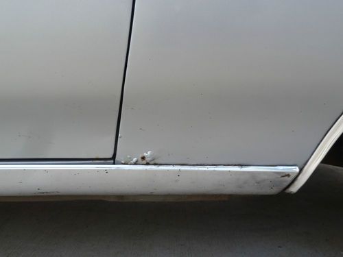 This is an original Nevada Silver car that was sprayed in 1983 with a low budget repaint that is showing its age. The car will need a few patch panels in all of the usual areas, including the bottom of both front fenders, the bottom of both rear quarters and below the rear window. The floor pans in the car have zero rust in them. The frame is sold and has never been hit. The trunk is also solid and containes an original G-78 bias ply K-Mart spare tire. The original GM bumpers are straight and true with a very nice original quality shine to them. The grill is cracked on the drivers side.