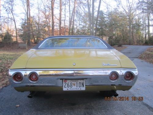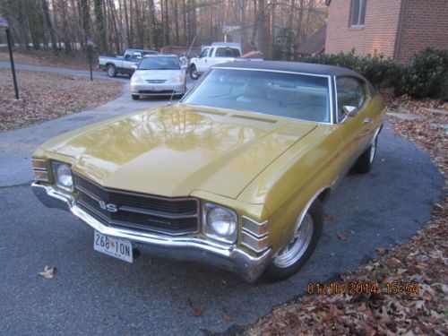 71' Chevelle,(V-8/400 cubic inch), Automatic transmission, stock rear, full gauges - oil, temp, voltmeter, new vinyl roof, new bumpers, (4) new BF Goodrich T/A tires, Billet Specialties-aluminum rims, new dual exhaust system (manifolds to tailpipes), dipped and reconditioned radiator, new distributor, new water-pump. LOW ORIGINAL MILEAGE 80,935 miles...All original documentation included. Adult-owned and driven. Must see to appreciate. Buyer will be reponsible for pick-up. Shipping shall be the sole responsibilty of the purchaser and must be agreed upon prior to auction close.