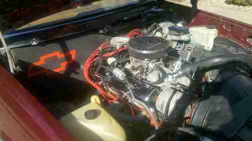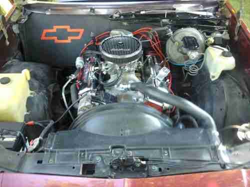 350 4 Bolt Main Bored 30 over = 355 cubic inch; Flat top pistons; Competition cam & lifters; Double Coiled Valve Springs; Double sprocket timing chain; Morosso 7 qt. deep sump oil pan; Edelbrock Performer Intake; Edelbrock Performer 600 cfm Carburetor; Accel Distributor Cap & Coil; Accel Plug Wires; K & A Air Filter; Heads 194 Intake; All new valves and seats; Port and Polished; 350 turbo transmission; B & M Transpack; 2200 stall convertor; Air shocks; New BF Goodrich Radial tires.