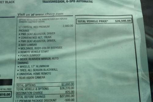 Moonroof, iPod/MP3 Input. LT trim, Crystal Red Tintcoat exterior and Jet Black interior. FUEL EFFICIENT 36 MPG Hwy/25 MPG City! AND MORE!======KEY FEATURES INCLUDE: Satellite Radio, iPod/MP3 Input, CD Player, Onboard Communications System MP3 Player, Remote Trunk Release, Keyless Entry, Steering Wheel Controls, Alarm. ======OPTION PACKAGES: LT CRYSTAL RED PREMIUM PACKAGE includes (GBE) Crystal Red Tintcoat exterior color, (BTV) remote vehicle starter system, (APG) driver power lumbar, (AG1) 8-way power driver seat, (DD8) auto-dimming inside rearview mirror, (UVC) Rear Vision Camera, (UG1) Universal Home Remote, (AP9) cargo convenience net, (B83) body-color bodyside molding, (CF5) power sunroof, (RA9) P225/55R17, all-season blackwall tires and (R1U) 17 (43.2 cm) 5-spoke aluminum wheels, SUNROOF, POWER, REAR VISION CAMERA, REMOTE VEHICLE STARTER SYSTEM, PREFERRED EQUIPMENT GROUP includes Standard Equipment. LT with Crystal Red Tintcoat exterior and Jet Black interior features a 4 Cylinder Engine with 196 HP at 6300 RPM*. Originally bought here. ======EXPERTS ARE SAYING: Great Gas Mileage: 36 MPG Hwy. ======BUY FROM AN AWARD WINNING DEALER: At the Orr Group in Texarkana, TX we treat the needs of each individual customer. We know that you have high expectations, and as a dealer we enjoy the challenge of meeting and exceeding those expectations each and every time. Allow us to demonstrate our commitment to excellence. Our experienced sales staff is eager to share its knowledge and enthusiasm with you. Horsepower calculations based on trim engine configuration. Fuel economy calculations based on original manufacturer data for trim engine configuration. Please confirm the accuracy of the included equipment by calling us prior to purchase. Orr Chevrolet in Texarkana is your Chevy Headquarters!*These prices include all applicable rebates through GM for Zip Code 75503. Although rebates are pretty standard everywhere, your location will ultimately determine which incentives you qualify for. We do not include accessories or dealer installed options in our pricing. Please call to confirm trim, mileage, options, and to ensure availability