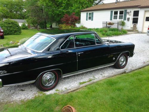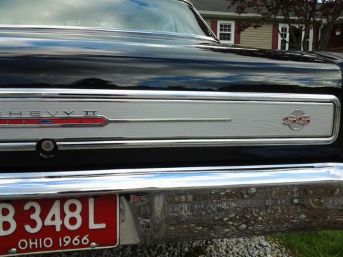 Up for sale is my black 1966 L79 nova SS with original drive train, block casting is 3791362, with a casting date of D256 and an assembly date of FO428ZG. With a VIN stamp of W175354 on the front pad, has correct 3890490 aluminum intake and original dated 3245 carb with a date of 6-3-3. Alternator is a 1100693 37A dated 6-C-29. Distributor is an original 1111154 dated 5-M-1 and still retains its original yellow stripe on housing, with a crane XR1 points replacement in stock housing. Transmission is also original 3885010 casting with assembly date of PO502 and 6W175354 VIN stamp on casing. Rear end is the original 12 bolt 373 ratio with a stamping of FO on the passenger side axel tube, with an assembly date of 04-28. Code is for a 373 metallic brake rear axel, trim tag of vehicle is 05E for assembly.Driver side mirror is original dated 4DMI5 stamp on mirror head. This car is a true black California car. Interior appears original except carpets and back package tray. I have to assume the mileage to be 104,356, Only because I am not the original owner and can not verify. Car was once owned by Reggie Jackson the baseball star. You will receive this with the purchase of the car. CAM is not correct, should be a hydraulic CAM but instead it has a solid lifter that runs very well. Car has all original sheet metal with no patches in quarters, fenders, doors, floors and trunk. Car has had no rust repair ever, CALIFORNIA CLEAN! Shifter is an original rebuilt factory shifter, with original console. Trunk lid insert is very nice original SS. Original tinted glass in vehicle except for windshield had been replaced. Car has had one repaint with door jams still in original paint. Beautiful smooth shiny black paint, see pics of 2 threaded inserts in area of bottom of trunk passenger side. This is an L79 part. There is no paperwork with this car, but it is original drive train throughout. Have your professional come verify, you will not be let down. Car is for sale locally. So bid strong. Car has rally rims under stock original hubcaps, can give car two different wheel looks in a snap. also have stock 66 wheels to go with. car also has disc brakes on front with dual mater cylinder for safety, have stock spindles, drums and master if you wish to convert back.