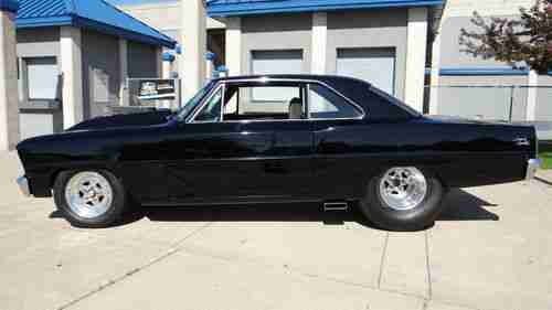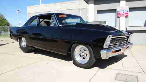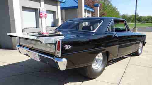 For your consideration is this gorgeous 1966 Chevy II Nova - Prostreet. Real 118 Super Sport, super straight body finished in Tuxedo Black, 355cid, Weiand 671 polished blower, dual Holley's 850 cfm, Keith Eickert billet air cleaner, MSD - 6A ignition, MSD timing control, turbo 350 auto with shift kit, Dana 60 rear end, 4.11's, 4 link rear suspension, adjustable coil-overs, front stabilizer, Aerospace Components front disc brakes, 3" exhaust with side ports (sounds incredible!!), stock dash, pioneer am/fm cd with remote, 8 point cage with easy access, center console with B&M shifter, Autometer Pro Comp Ultra-lite gauges & tach, bucket seats with power drivers side, speedometer works, very nice black tin work in rear interior, full stock headliner, stock door panels, 3 spoke sport steering wheel, polished 18 gallon fuel cell in trunk, factory fuel gauge works, Holley blue electric fuel pump, polished battery box, Ed Quay polished stainless rear wing. Nice & tidy engine compartment, stock unmolested firewall retaining original cowl tag, wiper & heater motors. Feel free to contact Kraig @ 563-386-2902 with any additional questions. The car is advertised nationally and may end auction early if sold. Can help arrange shipping worldwide. Thanks for looking !