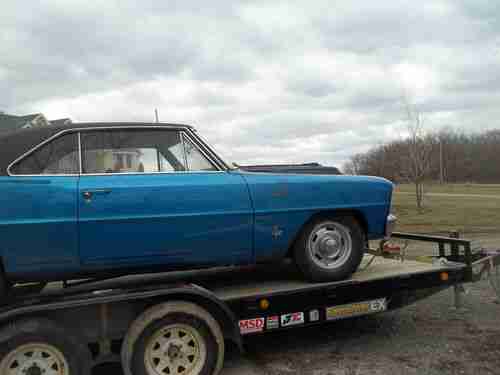 66 chevy 2 nova. has good floor and trunk area. 327 double hump heads. 4 speed muncie. car does run and drives. 12 bolt rear end. solid car. needs rear quarters. battery tray great. and frt end area great shape. car does need complete restoration. ss bucket seats. no console. has clear missouri title. very good builder.. this is not a ss car. but a v8 car. please call if any questions before buying. 816-294-6812. thanks ask for steve.