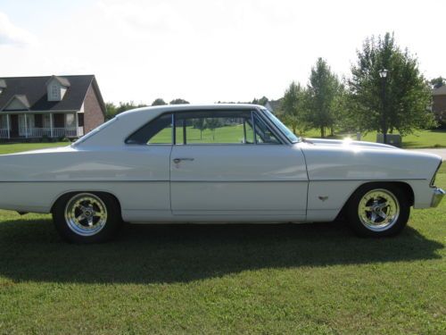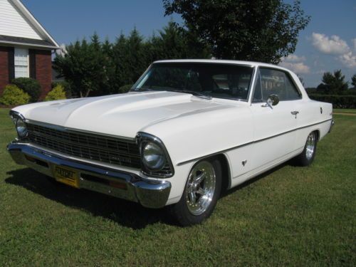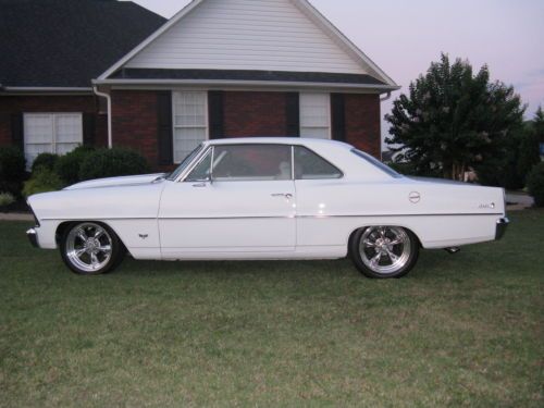 1967 Chevrolet nova pro touring restomod built with nothing but the best parts available to duplicate this car would cost you $85,000. easy. Front suspension is Heidts superide 2 subframe with coil over shocks,disk brakes and rack and pinion steering. Rear suspension is Heidts 4 link kit with coil over shocks,trackbar and subframe connectors. Rearend is a 9 inch Ford with a nodular center,Detroit locker,Moser axles and Willwood disk brakes, Driveshaft loops at both ends. New weldstar forged 5 spoke polished aluminum wheels with new M/T drag radials. Interior is gray leather low back seats and carpet, door panels ect with Covan's classic instrument cluster with auto meter carbon fiber gauges 160 MPH speedometer,10,000 RPM tach,oil,water,volts and fuel level. Billet specialties steering wheel and stainless tilt steering column. Engine is a powerful 434 small block with full Eagle rotating assembly Hydraulic Roller cam 598 lift w/ 240-248 duration Roller rocker arms w/ stud girdles Dart pro 1 ported aluminum heads Dart intake port matched to heads new Quick fuel 850 cmf carb MSD ignition coated headers full 3 inch exhaust with Flowmaster super 44 mufflers sheet metal valve covers and much much more No nitrous No super chargers No turbos No Ls1's 2's or 7's Just 630 Horses of power the way a 1967 nova should be it's 11 to1 compression makes 630 horsepower and runs well on premium pump gas. Also has a be cool aluminum radiator will run all day at 180-190 degree. Transmission is a Richmond 5 speed from Hightower racing new transmission disassembled all gears and shafts polished then re assembled shifts very slick and the 5 speed makes it a blast to drive. You can drive this car anywhere I've made two trips to the Myrtle beach Run to the sun shows around 270 miles one way car runs and drives flawlessly. Never drag raced or abused in any way . The last picture # 24 is what the car looks like with 17 inch wheels and low profile tires. Trust me this is not your Grandmothers nova you'll need to buckle up and hold on tight !! Any Questions or to make me an offer call or text Jimmy @ ( 864 ) 490-1939 anytime I also have a walk around video clip with the car running if you wanna see and hear it run text me your number and ask for nova video. This Is A Cash Only Sale Car is for sale locally I reserve the right to end this auction at any time.