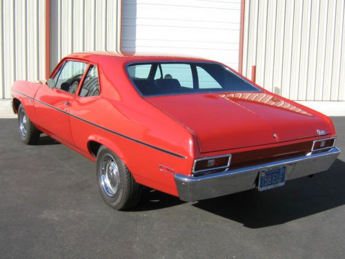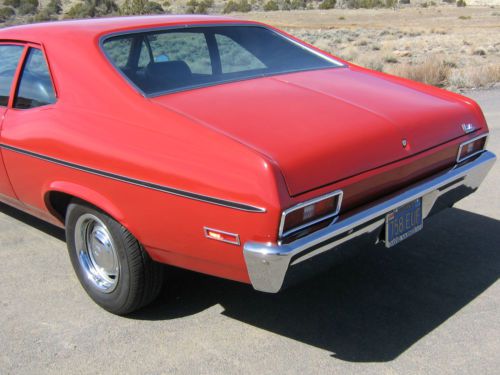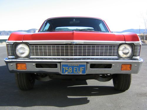 You are bidding on a 1972 Chevy Nova 2Dr coupe. It Is a rust free California survivor that has always been garaged when not being driven. It has only 55,000 actual miles and has always been meticulously maintained. I am the second owner. Adult owned and driven always. Has original 6 Cyl engine, Powerglide transmission, power disc brakes, power steering, and ten bolt rear end. Original color is code 75 Cranberry Red with standard black interior. Interior: The pics pretty much say it all. The interior is original and in excellent condition. Headliner is excellent. Everything works great, steering column is tight. Windows roll up and down great. Other than an aftermarket radio installed back in the day, you will not find a more excellent original interior. Drivetrain: Runs and drives like a brand new 72 Nova. Runs great, drives great, stops great. Has front and rear sway bars. Tires are new, newer battery also. Again, always maintained. Body: This is an original California car with no rust or body issues as you can see in the pictures. Sheetmetal is all original to the car, never had a panel replaced. Trunk floor is original with original spatter paint, no rust, and original jack and spare. Glass and trim are excellent, doors, trunk and hood fit and close tight, like new. Even the original door and trunk seals are in great condition. Other than minor paint chips scratches and parking lot dings, as you can see, this body is in excellent condition. Nothing over and above normal wear and tear.