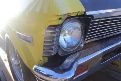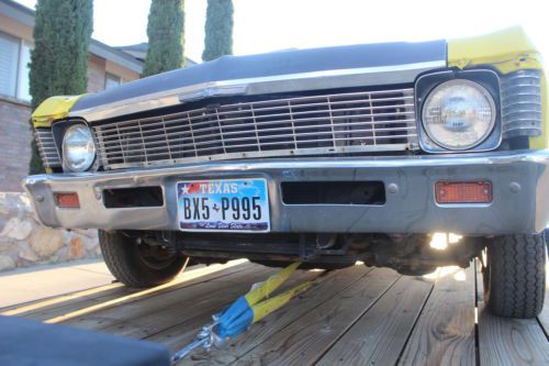 Up for your consideration is a 1972 Chevrolet Nova. This is a NO RESERVE auction, so last bidder wins this amazing car. This is a running car with lots of goodies and appeal, zero to little rust, just look at the pictures (the trunk says it all). This is a west-coast built/west-Texas kept car in very nice condition. Lots has been done to this car. I got this car from a respected local mechanic/hot rodder and I was going to give this car to one of my sons for high school, but this is too much car for such a young person (no airbags). Clear title. Car is loaded with lots of goodies, as I’ve said, to include: 400 small block Chevrolet (this engine has been bored over so the displacement is over 400 in3, but advertising as 400 in3 for clarity) Muncie M20 transmission (might be an M21, don’t recall) 4-speed Manual Transmission (clutch pedal functions well) Chrome alternator MSD 6AL box, MSD coil, and MSD distributor GREAT-sounding cam and lopey idle (lots of power) Mini-Starter Traction bars Aluminum racing rims (Weld Racing-style) and Mickey Thompson front tires and BFG rear tires with excellent thread/life Tachometer Flowmaster dual exhaust Nice driver-quality yellow paint Demon Carburetor w/ yellow metal stack and aluminum scoop (hood cut out) Traction Bars Line lock (needs to be connected again, but works) Aluminum Intake Headers Cutaway Hood Good bumpers Nice Stance Deep Throaty Sound Good glass (missing some stainless trim on the rear), but all glass is good. Windows roll up and down easily. Has a sound system, which honestly, I don't know too much about (but it's all there). Nice dash, aftermarket steering wheel (old school) Disc-brake front 8.25 rear end with highway gearing; easy upgrade to something better.
