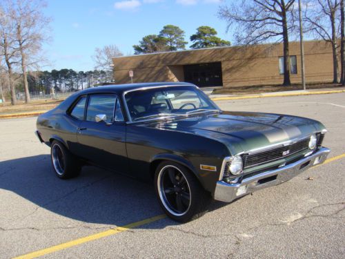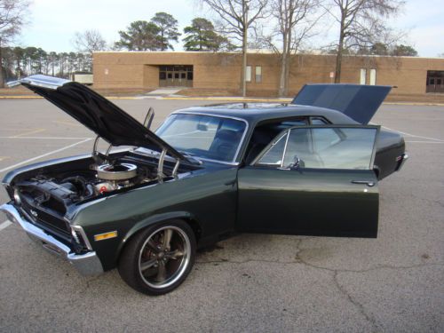 Absolutely gorgeous frame off restored 1972 Chevy Nova SS clone. Car is a 100% rust free California car with all original body on it. Interior is all original and in excellent condition with black vinyl bench seats and door panels. The motor is a 72 396 Big Block out of a corvette that was completely rebuilt. Runs and drives amazing! Pulls very hard and is a handful to drive. This car is better than new with lots of money and time in the build. The paint is a 69 Corvette fathom green that you must see to appreciate. It is just stunning and the pictures do not nearly do it justice. The stripe is a light bronze color and the 18" Boss wheels are painted to match. Over $10k in paint and body alone! The under carriage has been all powder coated as well as the frame. Rear end is a rebuilt GM 10 bolt with 331 gears.