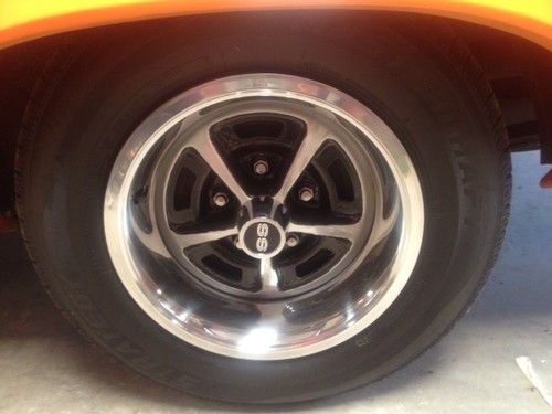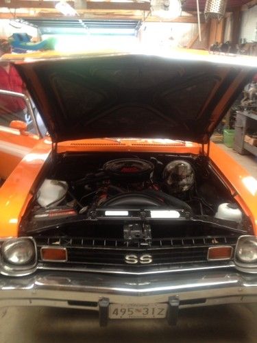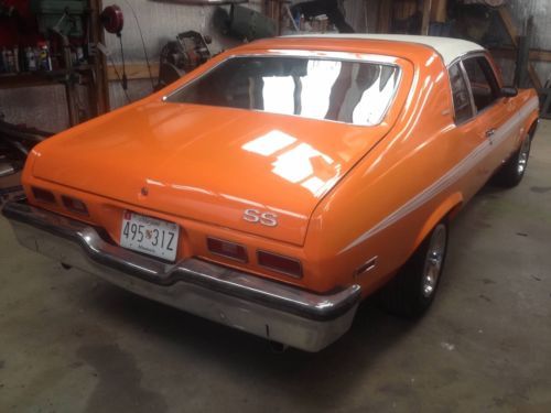 1973 Nova SS Hatchback 2 dr. Restored to original. 350 cubic inch engine, turbo 350 automatic transmission. Numbers matching original engine. all new sheet metal, rock solid body, new quarter , wheel houses, floor sections, front fenders, and trunk. New California Orange base/clear coat paint, Factory style SS side stripes (vinyl). New SS emblems, new white vinyl top, factory bright window trim, factory spare and inflator. New OER vinyl black interior over factory front bucket seats and rear fold down bench seat.. Black carpet, floor console and shifter. New rubber weather stripping, door sill plates. Restored 1970 SS 14x 7" SS wheels, YA code. Master Craft radial tires. Power frond disc brakes and power steering, new gas tank , new rear leaf springs. Dual exhaust from factory manifolds. 2 bbl. carb. 1974 front bumper stock rear bumper, have front factory bumper , needs re-chrome. Have new emergency brake cable kit.