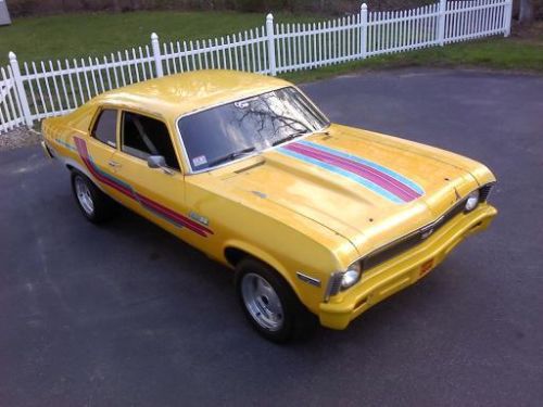 1974 chevy nova, built 350, 6 speed manual transmission, strange engineering 4.56 9" rear with 4 wheel disc brakes. Aluminum heads, Comp cam, roller rockers. Edelbrock intake, carb, water pump and timing gears. Be cool aluminum radiator, MSD ignition. Headers to 2 1/12 inch dual exhaust with glasspacks (car is LOUD!!) Power steering and power brakes. Have owned car for 9 years, driven for cruises during the summer, car is on the road and inspected. Car is quick, goes straight, and has plenty of power. Not a highway car due to low gears. Interior is in excellent condition, dash mint (nos part), auto meter pro comp gauges (water, oil) and tach with shift light. Everything works..heater, wipers and washer, turn signals, horn, lights, etc. Front bumper, cowl hood (pin on) and deck lid (bolt on) are fiberglass. Car has 68-69 nose. Boyd aluminum cragar wheels, 15x7 front, 15X8 rear. Recent tires all around. Full goodmark floors replaced, por-15 painted with dynamat type material. Door pins and bushings replaced.. The bad; Car needs paint and body work...this is how i bought it 9 years ago.. front fender has rot hole on lower bottom, paint peeling around windows, tail panel should be replaced .. passenger quarter was patched and is in primer. Speedometer does not work because the 6 speed trans has an electronic (not cable) output. There is a part called "cable X" that adapts the electronic to cable signal.. Car has no choke and must be warmed up when starting for first time, this is not at all a show car, its a driver to have fun cruising around with.. ASK QUESTIONS BEFORE BIDDING!! NO WARRANTY, SALE IS FINAL, I STRONGLY ENCOURAGE BIDDERS TO SEE CAR IN PERSON IF POSSIBLE. Located in Plymouth, MA. Selling because I want a Camaro..Car for sale locally, so I reserve right to end auction early. Buyer completely responsible for shipping. Clean title.