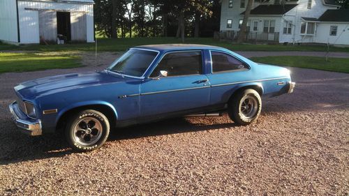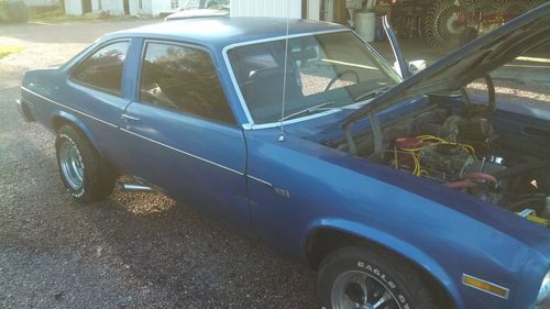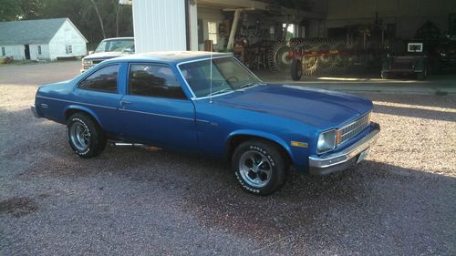 1978 Chevy Nova. Was originally a 250 straight 6 motor (which is included and in good mechanical condition) swapped out for a 350 from a Camaro and bored .060 over to make a 360CI, Solid motor mounts, Edelbrock aluminum intake, comp cam XE268, Roller tipped rockers, Heads were professionally re-done with all new everything before the motor was built, 650 true double pumper with mechanical choke, electric fan wired into temp sensor which kicks on at 180 degrees and has never been over 210, Howe aluminum race radiator, Jegs electric fuel pump with regulator and fuel pressure gauge, Hedman Hedders, Accel plug wires with billet distributor . Car has 57407 actual miles from the little old lady who owned it previously. Interior is as close to perfect as a 78 car can be. It has a three on the tree manual transmission. The car has no rusted through areas only very minor surface rust in some places. Passenger headlight bezel is cracked from a pheasant that just had to get across the road. Sub frames and underside still have original undercoating on them. Could use some new paint but still only faded from the years of weathering. This car would make a perfect restoration project. also comes with factory blue-moon eyed wheels and factory tires which are flawless so entire car could be put back to stock. If you have any questions or concerns I will gladly help as much as possible. Car is also for sale locally so I reserve the right to end auction early.