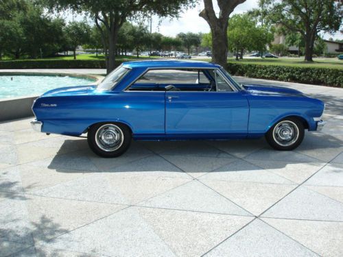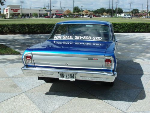For Sale is my beautiful 1963 Chevrolet Nova SS! Yes it is a true SS model (Z03 on firewall tag). 1963 Novas only came with 4 cylinder and 6 cylinder engines. This one now has a 350-4V with a mild flat tappet cam, topped with an Edlebrock polished aluminum intake and 650 cfm carb with electric choke. An Accel billet distributor provides spark through MSD plug wires. Billet Specialties valve covers top off the heads that have roller tip rockers installed. Ceramic coated Rewarder headers handle the exhaust through Flowmaster mufflers. Entropy crossflow aluminum radiator with dual electric fans keeps the motor cool. The TH350 trans has a shift kit, 2500 stall converter, aluminum deep sump pan. A Ford nine inch rear axle with a posi, 3.55 gears and 31 spline axles plants the power to the ground through the new 15" x 7"steel rally wheels. Weld in subframe connectors join front to back underneath. The TCI front suspension has a manual rack and pinion Mustang II style coil spring front suspension. Steering is done with a new Flaming River billet steering wheel attached to a Flaming River stainless tilt column. Power 4-wheel disc brakes brings it to a stop. All new black SS interior has been installed including upholstery front and rear, door panels, quarter trim panels, carpet and headliner. A new set of Dakota Digital VHX gauges keep the driver informed constantly and light up beautifully at night. All the electrical runs through a new harness front to back. Battery has been relocated to the trunk and has 1 gauge positive and negative Ron Francis cables running forward to the high torque mini starter. Outside is a gorgeous blue metallic PPG base coat/clear coat paint over all rust free metal with silver rear cove. THERE IS NO RUST ANYWHERE ON THIS CAR! That is because the cowl hood, front fenders, doors, quarter panels, floor pans, trunk floor and outer wheel tubs have been replaced. This car was built as a driver and not a trailer car. It is not a concourse restoration but more a restomod. This car gets thumbs up every time out and holds its own at outdoor shows. If you want more pictures let me know what you want to see. This is a must see to appreciate the time and money that has been spent to revive this car from the dead. A little over 1900 miles on car since completion. It is driven almost weekly when nice weather permits so mileage will vary. With all the restoration and upgrades, you can't build it for what you can buy it for! Serious cash buyers only need to call me at 281-808-2757 with any questions or email me with your questions or request for more photos. Please make only reasonable offers. Thanks for looking!