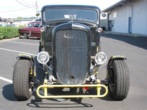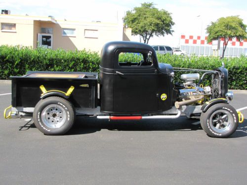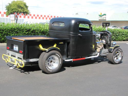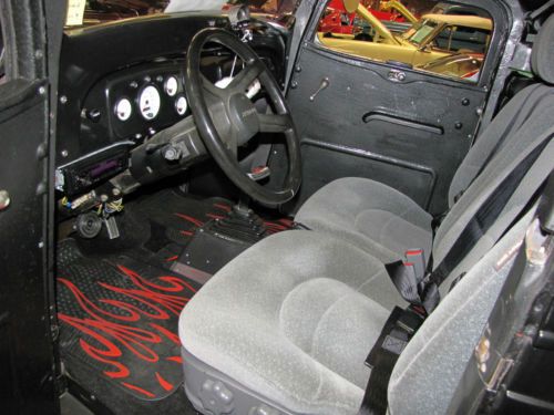 All Steel Body, Fenders & Bed On A Factory '37 Frame. Stock Cab Has Had The Top Chopped And The Bed Has Been Shortened 15". 1935 Chev Grill Shell, 1932 Ford Cowl Lights, Steel Fenders And Bed Mounted "Trunk". Front Straight Axle With Parallel Leaf Springs, Camaro Front Disc Brakes, Lincoln Positraction Rear End With Rear Disc Brakes. All