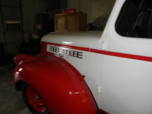 1946 Ground Up Custom Chevy Pickup Truck. 1. Mustang 2 Rack and Pinion Front end with coil springs. 2. 383 Stroker Engine with Custom built 350 trans. 3. Walker Radiator rated for big blocks. Keeps this truck running cool. 4. Custom Interior ($5000.00) with embroidered eagle feather and eagles on door panels and eagle on custom seat, with complete dura block sound proofing. 5. Custom Paint with molded headlight cans with custom indian head turn signals (from Indian Motorcycle) 6. New Chrome grill and parts. 7. New Stainless front bumper 8. New tires, hoses, battery, wire harness etc. 9. New crankout windshield, new tinted glass. 10. Custom gauges, title column with Banjo wheel. 11. Power windows and Remote door openers. 12. Custom delux all weather truck cover included..... This truck is a head turner and nice cruiser and will always get you home. Look at pictures and see all the custom features. Over $40,000.00 Invested (without my labor). I will answer all questions and respond to all serious offers.