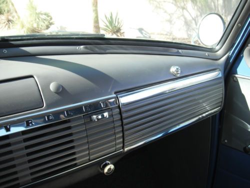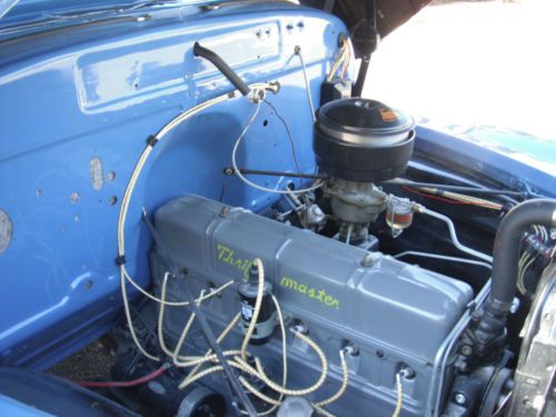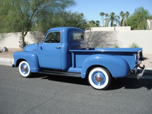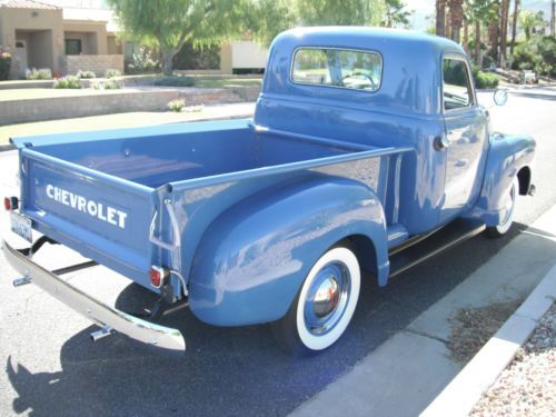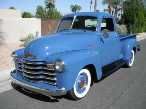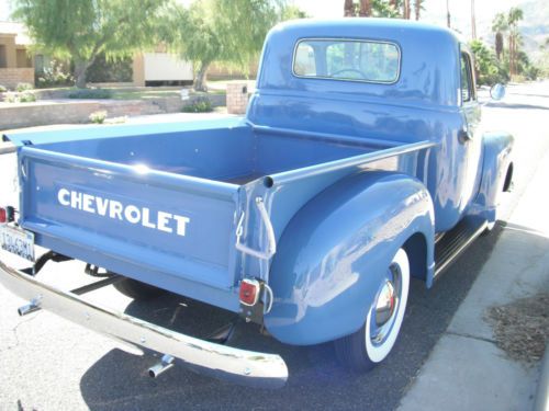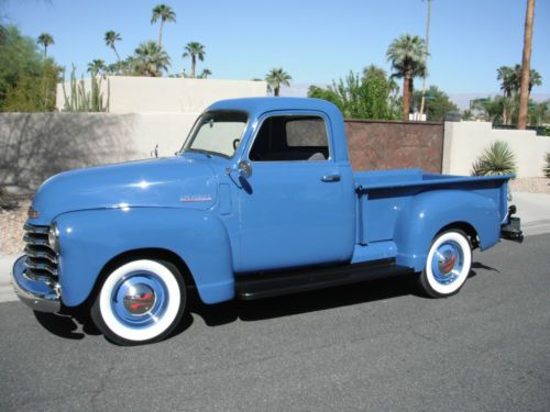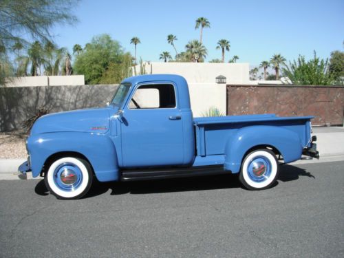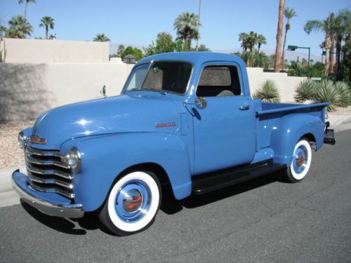 1949 chevrolet shortbed 1/2 ton 3100 pickup , very sharp looking truck that was partially restored when I got it . Basically all stock straight six , 3 speed on column etc. upgraded to 12 volt with new alternator and battery . 148 miles on odometer since restoration . I disassembled and steam cleaned everything , had a beautiful 2 stage Mariner blue paint job done color sanded and buffed , entire bed is brand new , sides , tailgate , front panel , fenders , everything ! Custom oak bed wood with new polished stainless strips and hardware , new mounting kit . Brand new running boards . All new glass and weatherstripping , all brand new chrome grille , bumpers , emblems , hubcaps etc. , brand new coker wide whites on stock 16 " clip wheels powdercoated matching blue with grooved trim rings . I restored the dash , restored and working gauges , new window channels , new windlace , new reproduction stock rubber floor mat , new headliner and visor , new door panels , new kick panels , new trim etc. brand new steering wheel , runs and drives great , new brakes , e brake works with new cables , new shocks , new u bolts , brand new mufflers and exhaust , rewired with stock loom , engine nicely painted and detailed . Cleaned and painted underneath . Wipers don't work , new stainless arms and blades though . Can transport to L.A. or the docks if you would like to export it for $250 once paid in full , you are welcome to come get it in beautiful Palm desert Ca. Sold as is , ask all questions or come inspect in person before bidding . I require full payment by bank wire transfer with 3 days . I have a clear Ca. title and it is currently registered . I reserve the right to end the auction at any time if a deal is struck . Original vin tag in place matching the title .