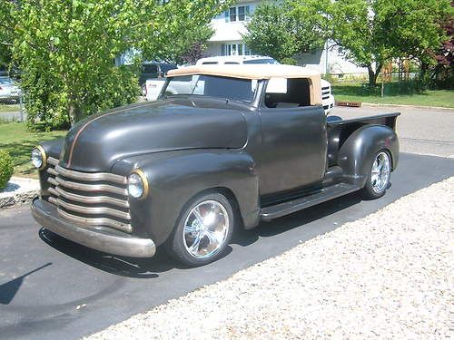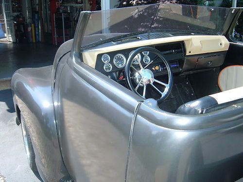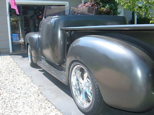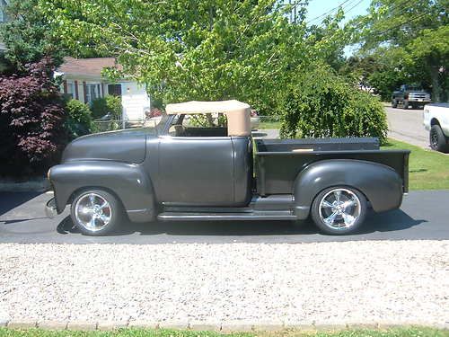 I AM SELLING A 1949 CHEVROLET TOTAL CUSTOM 1 OFF BUILD......THE TRUCK STARTED AS A BARN FIND AND A VISION......THE BODY WAS TAKEN OFF FRAME,DOWN TO BARE METAL,ALL RUST/ROT CUT OUT AND REPLACEMENT PATCH PANELS WELDED IN....THE FRAME WAS TAKEN DOWN TO BARE METAL, WELDED IN CAMARO FRONT CLIP, AND ACCOMADATIONS FOR NEW MOTOR,TRANS AND CAMARO REAR...THEN SEALED WITH POR 15 PAINT..SET BODY BACK ON FRAME,FILLED THE BED RAILS,SHAVED THE DOOR HANDLES,PANNED THE REAR,THEN CHOPPED THE TOP AND CREATED A CUSTOM REMOVABLE HARD/ CANVAS TOP... AT THIS TIME, REPLACED EVERY SINGLE NUT AND BOLT WITH NEW.....IF YOUR GOING TO DO IT RIGHT, THEN YOU DO IT RIGHT...BODY IS A 10 OUT OF 10...STRAIGHT AS AN ARROW....THEN CAME THE PAINT...A SATIN GRAY....AWESOME...BRONZE DIPPED HEADLIGHT TRIM RINGS,ADDED IMPERFECTIONS TO GRILL, AND SATIN CLEARED THE FRONT BUMPER TO GIVE PATINA APPEARANCE.(ALSO INCLUDED IN SALE IS REAR BUMPER)....NEXT CAME THE COMPLETELY WENT THROUGH SBC 350 AND TURBO 350 TRANS...MOTOR IS STOCK BUILT FOR DEPENDABILITY....TRANS JUST SIMPLY ADDED SHIFT KIT...REAR IS CHEVY 10 BOLT WITH HIGHWAY GEARS.... NEW PROFESSIONALLY INSTALLED PAINLESS WIRING HARNESS..EVERYTHING WORKS, LIGHTS, HI-LOW BEAMS, WIPERS,GAUGES,ETC....DASH IS FULLY CUSTOM WITH LED BULBS ON GAUGES,AND A KENWOOD CD/MP3,IPOD RADIO WITH SPEAKERS MOUNTED UNDER DASH...SOUNDS AWESOME...FULL TILT COLUMN W CUSTOM BULLET STEERING WHEEL..FULLY FUNCTIONING E BRAKE...INTERIOR SEATS AND DOOR PANELS WHERE DONE IN TRADITIONAL HD COLORS...BLACK,BEIGE,AND ORANGE..THEN CAME THE CUSTOM RIMS TO FINISH OFF... RIDLER 17X8 WITH FALKEN 225/45/17TIRES UP FRONT AND 18X8 WITH FAULKEN 245/45/18 TIRES IN REAR...THE TRUCK STICKS TO THE ROAD AND HUGS THE CORNERS...RUNS LIKE A BAT OUT OF HELL...AND BEST OF ALL....ALL THE HARD WORK DONE... NORMAL WEAR AND TEAR...CLEAR 1949 CHEVROLET TITLE...REALISTIC RESERVE...THANKS FOR LOOKING