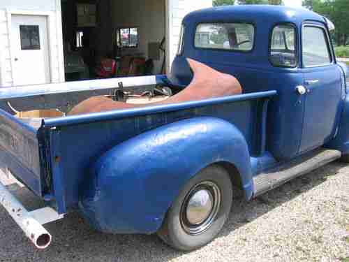 This is my 1949 Chevy 5 window short bed pickup. I bought the truck planning to restore it but don't have the time. It is all original except the motor. It has a 230 6 cylinder in it. It runs & drives but needs a lot of tinder loving care. Someone has patched the floors so I am sure there is rust. This truck could be driven like it is or restore it & make a good truck out of it. I have some extra parts that go with the truck { 2 front finders, hood, 3 window cab & lots of small parts if you want them}. I have many pictures of the truck so that should tell you more about the truck than I have wrote. If you want more information you can email me or call Jim at 620-378-3837. This truck has no reserve on it.
