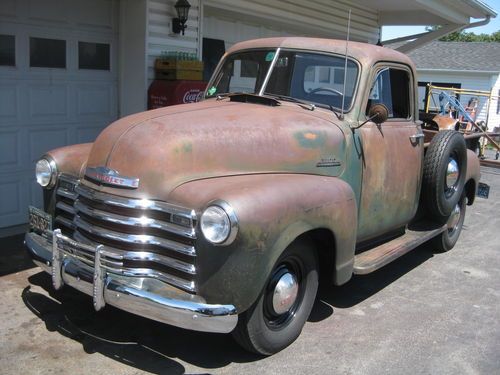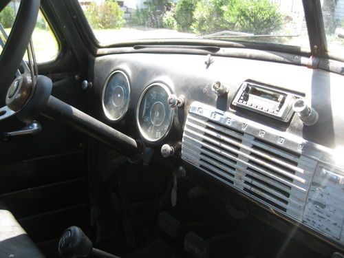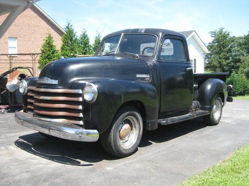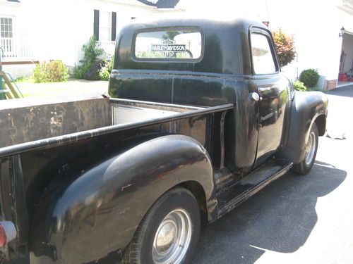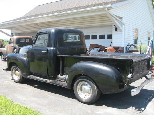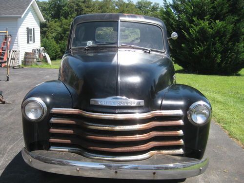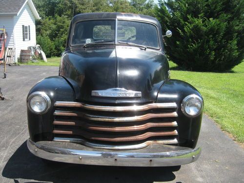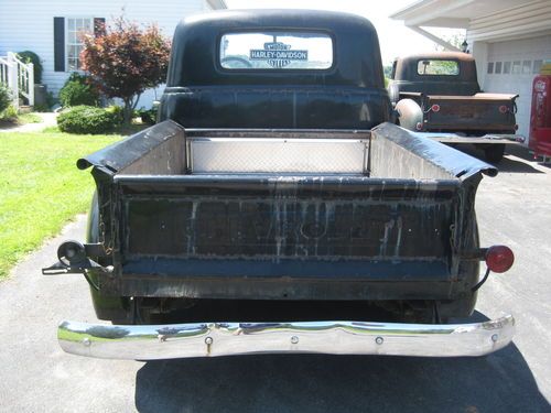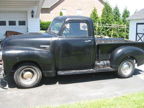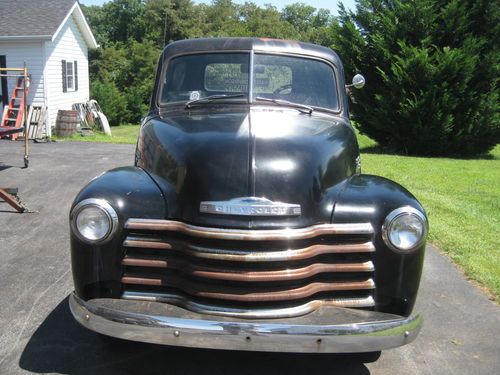 1949 chevy 1/2 ton with 4 speed trans, 216 engine an offenhouser intake two carb set up. 12 volt. tuck is complete an ran good when parked about a year ago needs new battery, fluids, exhaust work, brakes have leaked down from setting, wouldnt need to much work to get it running strong again please see all pics as to its condition, pretty solid truck to drive like it is, has normal rust cab corners and floors are good with some small holes and has had some small patch work done. reserve is very fair for this truck, sorry NO TRADES. restore or hot rod build. has clear Va. title can deleiver to a resonable distance at $1.85 per mile $ 400.00 min. or arange your shipping will help to load. bank wire transfer cash all other forms of payment will have to clear before truck is released.