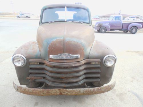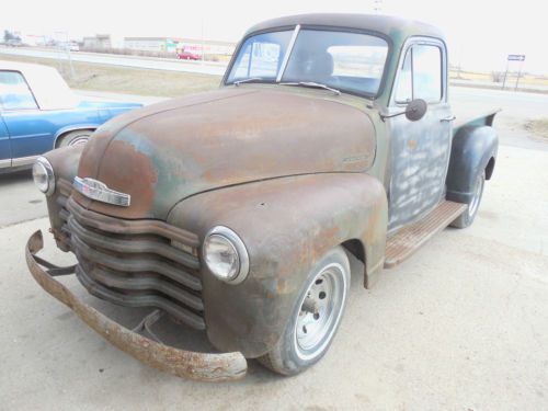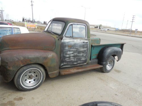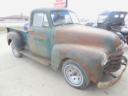 1952 CHEVY SHORTBOX , HALF TON PICKUP; THIS IS AN OLD SKOOL, NICE BUILD, USING LATER 50'S REAR, AND FRONT HUBS; 5 BOLT CHEVY ALL AROUND; IT STARTS RUNS, DRIVES AND STOPS. IT IS MOSTLY SOLID, SEE PIX. SOME RUST IN TOE BOARD CORNERS OF CAB. IT HAS BEEN SITTING A WHILE , SO WE HAVE CLEANED GAS, FRESH BATERY, THEN SHE STARTED AND RUNS GREAT. THE MOTOR SOUND GREAT. VERY STONG, POSSIBLY A NICE CAM. FOR QUESTIONS ; FOR A REASONABLE SHIPPING QUOTE; JEFF 218-464-2821 |