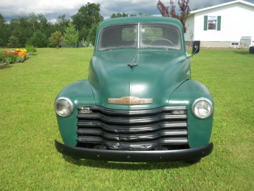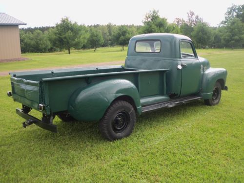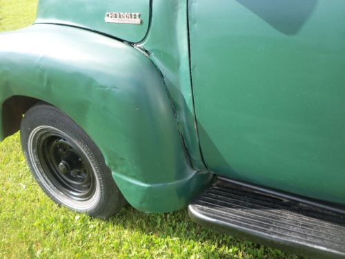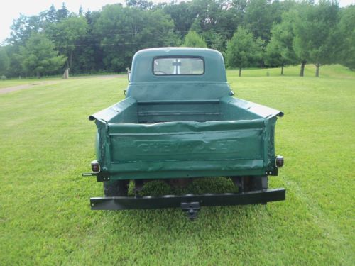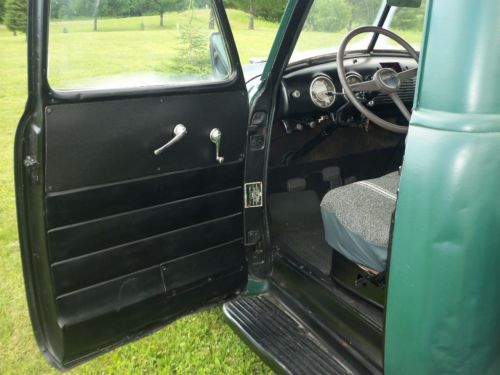 This is a decent 1953 Chevy 3800 Long Box Pickup. Truck is mostly original. Was used as a farm/wood hauling truck for most of the later part of it's life. Probably used a s a farm truck in first part of it's life. Before me, the last time it was registered was 1990. So it had been unused for about 25 years before I brought it back to life and started driving it. I believe I am the third owner, but don't know for sure. I've got past registration slips dating back to 1974 from the person that owned it before me. Good old truck. Still has the original 216 inline 6 cylinder engine, which the book says put out about 90 HP. Has the original 4 speed manual transmission. Manual brakes and steering. Engine runs good. Transmission works good. Steering works good. Brakes work sufficient to be driven but should probably be replaced with new or upgraded. I did install a new master cylinder and cleaned the individual brake cylinders. Truck has the original 6 volt electrical system, which works good. Always starts. I changed oil, plugs, and points. Because blinkers didn't come out until 54, I installed blinkers and new tail light assemblies. Lights work. Everything on the dash works except the fuel gauge. Truck is registered and licensed with clear title. I use the truck often. Tires are aged, so I don't drive far. Has the original split rim wheels. Drives fine. Clutch works good. Clutch throw out bearing whines a little when clutch is depressed, so will need replacing before too long. Heater fan works and heater/defrost seem to work. All glass is good. I've included a lot of pictures of the body to show it's condition. Has rust holes in cab corners, and a few other areas which should be seen in pictures. Has numerous dents and dings, mostly from use as a wood hauler (I've been told that adds character....?). I installed boards in bed. Because it had multiple layers of brushed on paint, I sanded the truck down and put a coat of primer and paint on it. Not a professional job by any means, but it looks a lot better than it did. I also patched the floor where needed and installed new carpeting and matts. Plus I put a cover on the bench seat. Doors shut, but need some adjustment, sticky. Could use a new set of door handles too, loose. Frame is in good shape, no indication of frame repair or accidents. Hood is good. Horns work. Identification plate says truck was built in Janesville, WI in Sept. 1952, was 1890th built that year. Because it was built in Sept., it was sold as a 1953 model. Has 137" wheel base , 8800 GVWR. Engine was made in Flint, MI. Good old truck that drives and runs. See pictures for best description. Contact me with questions of if more pictures are needed. Will assist in loading. Can be driven on trailer. Delivery is a possible option depending on distance. Can be discussed with buyer. Accepted offers, over my starting price, is always possible, using the "buy it now" option, as long as no bids have been placed.