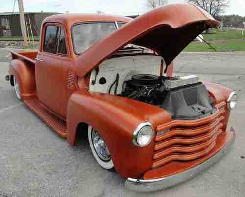 This 1953 Chevy truck is a great truck to get in and drive. It needs nothing done! The features include: Rust free body that has been professionally body worked and painted flat copper, Camaro subframe, 350 crate motor, 4 speed trans, 10 bolt rear end, power brakes, power steering, a/c and heat, Coker tires, 1954 Chevy car dash and steering wheel, late model Chevy truck seat re-done in weathered looking vinyl, all new glass and weatherstrips, new chrome bumpers and a pinstriped cooler. Happy Bidding! Charles (636)578-2270