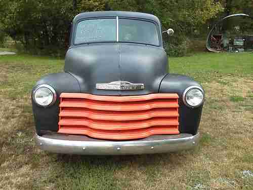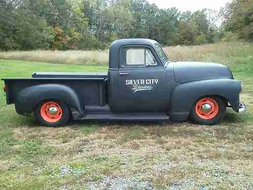 1953 chevy truck. We call it a rat rod but this truck is built safe you can drive it anywhere. It is setting on s10 frame which has been took all the way down and sand blasted and it was sprayed with epoxy primer and then painted . All parts are new on the frame new front end parts -new brakes new brake lines new alluminum fuel line - new fuel cell. It has 350 engine- 350 turbo trans power starring power brakes new eldeldebrock carb - alluminum intake - new dual exhaust all the way out the back New dolphin gauges the truck has been blasted also except for the hood and the doors it is in flat black epoxy primer. This truck runs and drives good we built this truck last year need to sell so we can finish another project this truck has good solid floor boards. The running boards are good The truck has all the dents left in it has not any body work done to it the truck could be made into a shiner we like it the way it is now gets alot of attention.