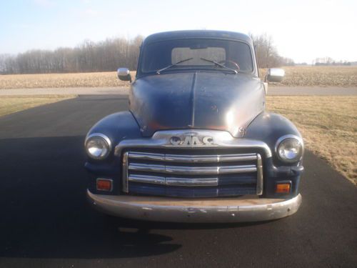 1954 GMC PICKUP SHORT BED. VERY SOLID BODY. DOE"S NOT HAVE FACTORY ENGINE. SOMEONE PUT A 1973 TO A 1979 250CI SIX CYL. IN IT RUNS AND DRIVES. AUTOMATIC TRANS. HAS DENTS AND SCRATCHES AS IT SHOULD ITS 60 YEARS OLD.THE GRILLE HAS DENTS ALSO. IT HAS THE FACTORY WOOD FLOOR STILL IN IT.IT COULD USE A TUNE UP. STARTS OK RUNS A LITTLE ROUGH TILL IT WARMS UP. BUT IT DOSENT HAVE THE CHOKE HOOKED UP.IT COULD USE A HAND CHOKE. THE OIL PAN HAS A SMALL LEAK SOMEONE TRIED TO PATCH IT. SHOULD HAVE BEEN REPLACED.ALSO I WAS TOLD IT HAS A CAMARO REAR END IN IT. I KNOW ITS BEEN CHANGED BECAUSE THE REAR END IS 5 LUG AND THE FACTORY FRONT HUBS ARE 6 LUG. LOOKS LIKE SOMEONE HAD A V8 IN IT AT SOME TIME. THATS WHAT IT NEEDS IT WOULD BE A GREAT STREET ROD. LIKE I SAID IT HAS SOME MINOR DENTS BUT THE BODY LOOKS REAL SOLID. HOW EVER THE RIGHT REAR FENDER IS THE ROUGHEST PART. ITS REPAIRABLE. I DID THIS WORK MY WHOLE LIFE SO I KNOW IT CAN BE REPAIRED. BUT I WAS LOOKING ON E-BAY AND YOU CAN BUY THOSE REAR FENDERS FOR AROUND 350.00 DOLLARS EACH. THATS WHAT I WOULD DO TO THE LEFT SIDE ANYWAY WHERE THE SPARE TIRE WENT THEN IT WOULDNT HAVE THE CUT OUT IN IT. OR THEY ALSO USE TO JUST PUT A PATCH OVER IT AND MAKE A ROUND FENDER. NOW I SOLD A 1954 CHEVY BELAIR ON HERE AWHILE BACK I COULDNT FINISH IT DUE TO MY HEALTH. BUT THEN I SEEN THIS AND THOUGHT IF WE COULD DRIVE IT THE WAY IT WAS MAYBE I COULD SEE A FEW MORE SHOWS HAVING MY SON DRIVE US IN. HOW EVER AND THIS IS MY FAULT THE AD SAID STARTS RIGHT UP. AND IT WOULD IF YOU POURED GAS IN THE CARB FIRST. ANYWAY I TRY TO TAKE PEOPLE AT THEIR WORD. I HAD TO PLUG OFF SOME AIR LINES AND ADJ. SOME THINGS NOW I CAN START IT OK . I DID PUT NEW INTERIOR DOOR PANELS IN IT AND A NEW GRANT STEERING WHEEL. BUT EVEN THOUGH I DROVE IT UP AND DOWN THE ROAD WHERE I LIVE IT STILL NEEDS MORE THEN I CAN DO LIKE THE OIL PAN I DECRIBED AT THE START. SO I THINK IM DONE I HOPE SOMEONE GETS IT THAT WILL ROD IT OUT. THATS WHAT I LOVED TO DO BACK WHEN. PLEASE ONLY BID IF YOU INTEND TO FOLLOW THRU AND PAY SHOULD YOU WIN. THE LAST ONE COST ME MONEY FROM FALSE BIDDING.ALSO I WILL END THIS EARLY IF SOMEONE KNOCKS ON THE DOOR WITH CASH. YOUR WELCOME TO COME LOOK AT IT BEFORE YOU BID. OR I WILL ANSWER ANY QUESTIONS THAT I CAN. THANKS FOR LOOKING AND GOD BLESS.. SOLD AS IS . THIS IS A PICKUP ONLY PLEASE. I HAVE BLOCKED 2 OTHERS FOR FALSE BIDS. I AM GONNA TRY TO GIVE ALL A CHANCE EXCEPT THE 2 I HAVE BLOCKED.