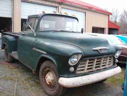 1955 Chevrolet 3800 Pickup, This truck is a true barn find. It is a two owner.The last owner bought it in 1971.It was used as a farm truck and was driven until 1993 when the owner became ill.He died in 1996. The son was so upset about the death he never went back to the farm where the vehicle and the farm machinery was stored. The farm was recently sold and i bought the truck. The truck was running and driving when it was parked. The truck is original 6 cylinder, 3spd, the motor is tight from sitting. The body is original, other than a few touch ups it has original paint.It does have some rust on the cab corners,bottoms of the front fenders, and some bubbling on the front eyebrows. Overall the truck is solid, the doors have no rust,the cab floor is nice. It is a great truck to restore, street rod, or leave it the way it is. There is a reasonable reserve so bid to own. If you have no feedback please email me before bidding.