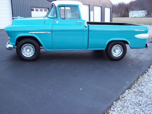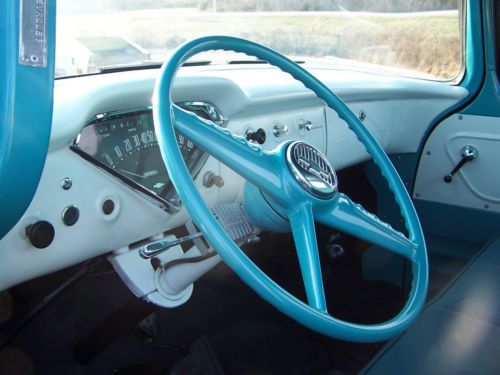 1955 Chevy 3100, Teal and White interior and exterior, Custom fleet side bed, powered by a 350ci with a th350 transmission, full restoration all new everything, Runs and drives great needs nothing. Feel free to email or call (931)267-7648 with any question and check out my matching 55 belair auction buy them both for $35000! thanks