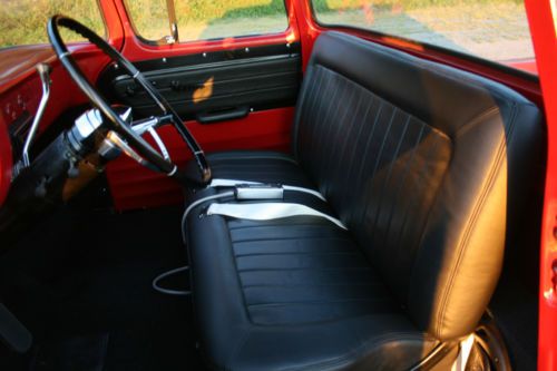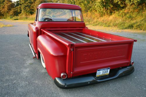 You are bidding on a 1956 Chevy Stepside, Big Window 3100 out of my personal collection. This truck is a turn-key head turner! It features a 70's Small block 350 mated to a TH350 transmission. It runs and shifts great! It was assembled in 2013 so everything is new! The paint is a gorgeous satin red and there is no rust anywhere. The interior was installed last fall and turned out great. The truck is very reliable and built very well. Headlights, turnsignals, brake lights, gas gauge, speedometer all WORK! There are aftermarket gauges installed to view oil pressure, voltage and engine temp. There is also two pressure gauges to monitor the airbag system. The truck also features a kenwood cd/ipod/mp3 player hooked up to two speakers and a sub (which is always great on long trips). As you can tell by the pictures its in great shape and nothing to hide. Below are a list of upgrades and pictures. If you have any questions or additional request, please feel free to contact me. Clear PA Title in hand. Sorry no trades.