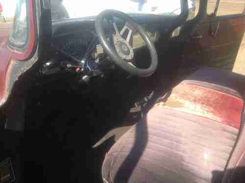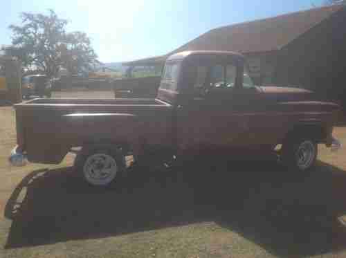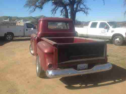 This is a 1956 chevy stepside with short bed. it has an older registration on it and the body is in real good condition. it has a 327 motor bored 30 over with all the paperwork of what was done to the motor. It has a four speed manual transmission, it has rear air shocks, very good rubber all the around on alumimum rims, new radiator, new wiring, new fuel tank, gauge work, heater works, door lock works, windows work, doors open and close good and so does the hood. The registration is current and the truck runs good. The body is straight and it has french in tail lights, all the light work, this truck can be driven home no matter where your home maybe. this truck would have no problem making a long trip.There is no rust on the body. The bed wood is rotted and it has sheet metal over the top. The driverside window is cracked and so is the wind wing. the windsheild has a chip.The paint is worn, but the body is very straight. It won't take very much to make real nice.