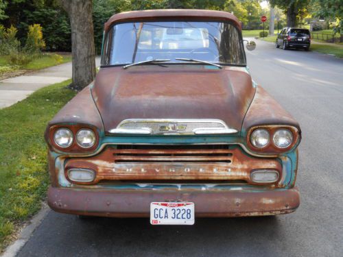 I'm selling my 59' Chevy Apache. It is from Arkansas. Runs and drives. 6 cylinder, three on the tree. fun to drive. The gas tank and carb were recently replaced. Has nice look with patina. mainly surface rust but there are a few holes, top of front fenders, small spot on lower front fender, a hole inside passenger step. some rust on bottom of rear fenders, not bad. The floor, cab mounts, frame, around front and rear windows and rest of cab, hood all solid. Be a good one to restore or cruise it like it is. If you have any questions you can call me 740 eight one six-3111. or message me. Thanks.