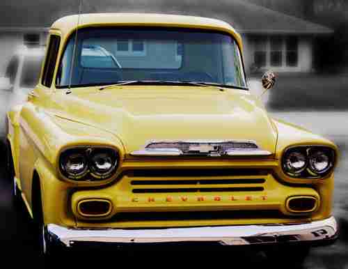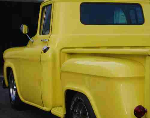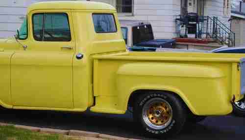 1959 CHEVY STEP SIDE PICK UP. 350 ENGINE WITH 350 AUTOMATIC TRANSMISSION. STRAIGHT AXLE FRONT END. HAS NEWER DRUM BRAKES ALL AROUND, AND BRAKE LINES AND WHEEL CYLINDERS. IT IS CORVETTE YELLOW. ITS IN GREAT CONDITION WITH A LITTLE BIT OF BODY RUST. NO REAR BUMPER. DRIVES GREAT.
