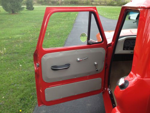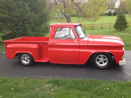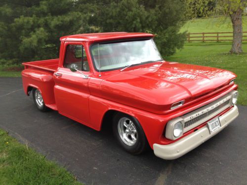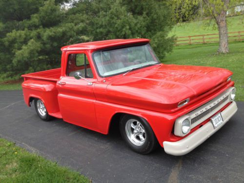 1966 Chevrolet Hotrod Short Bed Pickup Ready for the Car Show’s Built to Drive in comfort Super Sharp and Reliable Truck Being offered is a super nice 1966 Chevrolet Truck that was built for years of hassle free comfort and enjoyment. The truck has a slick torch red finish that glistens over an all steel body that is super straight. The wheel and tire combination add to the stunning looks of this truck. This truck gets attention everywhere it goes. The interior of this truck is as nice as the exterior. Take a look at our feedback and buy with no worries. As always we encourage pre-bid inspections. Please contact Tom at 513 608-8121 if you have any questions.