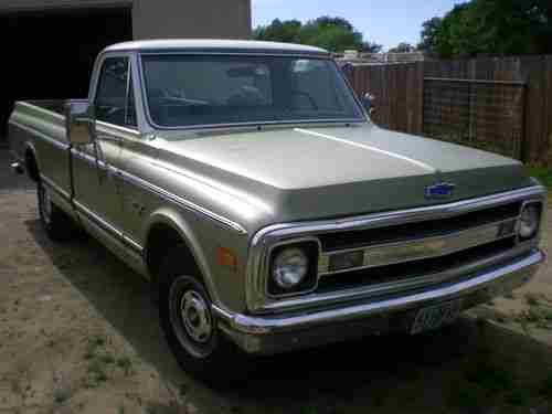 1969 Chevy Custom/10. This truck is in excellent condition. The truck has the original motor and trans. Everything has recently been serviced, ready for the road. The A/C blows cold air. This is a true survivor. Beautiful truck. Runs real well. I purchased this from the original owners daughter who's Mother just recently passed. There is one dent in the back as picture indicates and on the grill which the picture also indicates. The truck has been under a carport for most of it's life. Owner took excellent care of it, as daughter indicated, and I see to be true.