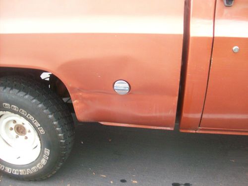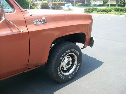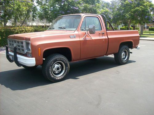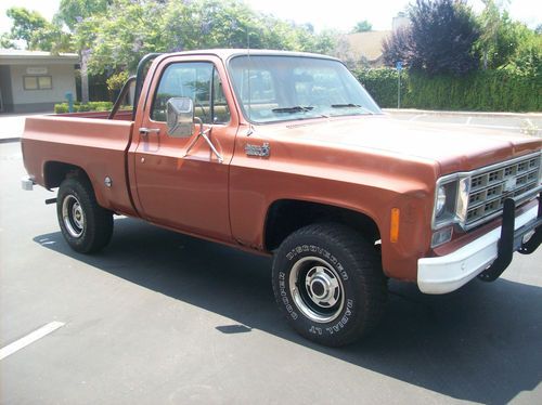 1977 Chevrolet K-10 short bed 4x4 truck. V-8, auto trans.I bought this truck for the previous owner, his uncle bought it new in 1977 and he bought it in 1980 and has owned it for 33 yrs, I recently bought it , so its basically a one family owned truck. The truck has a 350 crate motor installed appx 6k miles ago. The truck runs and drives great, What the truck needs is, the A/C doesn't not work, it will need a new drivers side fender as it has been hit and rusted at bottom, there a dent on underneath the gas filler on the bed that needs to be fixed... There is normal rust, but not that bad for this old of a truck.. Threre was a camper shell on it that I took off, so there is some paint wear around the rear window. the seat is torn.. As far as the rest of the truck, everything else works. runs and drives great.... Buy responsible for pick up. I am not sure exactly how many miles are the truck.