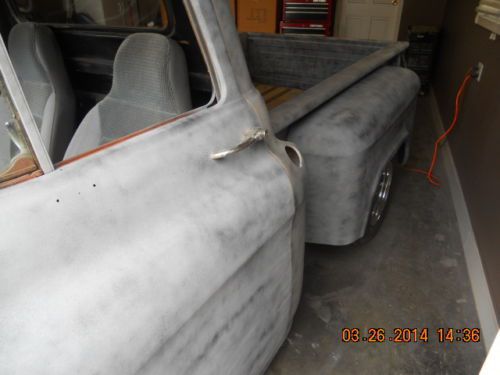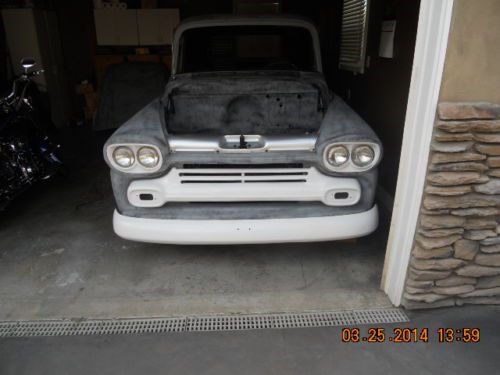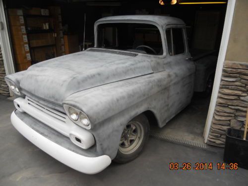 Here is a 59 Chevy Pickup.. Hot Rod.... Clear Calif registered title in non-op. 78.Camaro Sub-frame beautifully done. Power steering,custom steering shafts,Power disc brakes (under cab) detailed chassis, rotors, calipers, new brake lines & brakes throughout, front sway bar. Chassis has been completely detailed & sits nice & low all around. 81 Camaro10 Bolt rear w/new mono leafs & new brakes. Brake lines, hubs, axles, backing plates all detailed & painted. Entire truck has been undercoated incl fenders. Firewall partially filled & detailed,newly bead blasted inner fenders (not shown). Cab floor & top insert prepped & primed, top of dash prepped. Shaved front bumper along with grille & light bezels painted off white. Power booster, master cylinder, residual valve relocated under floor (not Installed) (need remote resovour) .New brake pedal & pad. New trans cover (steel).. Body is very nice & straight with small digs here & there, new primer & guide coat throughout incl bed. Cab is extremely nice. Will need new passenger door or new bottom skin (rotted thru), also a spot at bottom of inner door hinge area. Patch panels already installed at rear & back areas of cab. Rear fenders have a small crack at a rear mounting hole (can't see). Dash is nice & unbutchered, top prepped w/trim piece, bottom needs prepping & one small hole filled. Hood was stripped inside & out for 100 louvers. Extremely nice w /only a couple small areas needing work.(re-primed w/out louvers added) (can easily remove primer at center for louvers). The following parts are either New or Newer & included in the sale:.... Many parts have been detailed & painted.....New gas tank & sending unit, new mounting pads, newer mounting straps(painted), gas filler (painted), hoses & stainless cap,new custom trans mount (painted), newer gauge unit & chrome bezel, new gauge lens,new heater temp/defrost switches & chrome bezel(expensive),newer stainless parking bezels & new lenses & gaskets, new partial wiring harness,newly blasted & primed inner fenders (gorgeous), new starter switch w/2 keys,new cab mounting set, new bed bolts,new inner fender rubber mts, (newly painted & installed mounts to cab),(1) new inner fender to fender r/seal, newly painted & installed hood hinges & all under hood mts, newly detailed & painted large radiator brace/mount & cover (cover in silver/gray & gorgeous),new radiator r/mounts, (1) used radiator, (2)new firewall rubber inserts for wiring,newer chrome w/washer bezels, nuts & r/seals,newer wing window handles, springs & r/seals, (1) new wing window channel w/chrome trim,(2) new rubber door bumpers,new inside window handles & r/seals,newer inside door handles & r/seals,newly bead blasted & painted vent covers w/ new gaskets,newly painted license plate holder(frt),newer stainless dome light base w/wiring & new bulb,new mohair mounting felt, newer outside chrome door handles & r/seals, one new chrome lock button & spring, newer headlight switch & knob, dimmer switch, used glove box & screws,new perimeter door rubber seals (both),new hood to cowl rubber seal & clips,newly painted parking brake handle & used hardware, (2) small horns, (1) new exhaust cover, (2) bucket seats,newly purchased used front windshield w green tint, new side glass, new window felt, new steering u- joints, shafts & rag joint, older Gm column now mounted w/spllined shaft (needs new one), (4) newly painted inner fender braces, headlights w/wiring, newly detailed power booster, master cylinder, residual valve & all brake lines & power steering pump. Nice older heater also included. Note: Some parts are not "completely" bolted together (finish) and will be delivered that way, and will need buyer to finish as needed. Needed to finish....