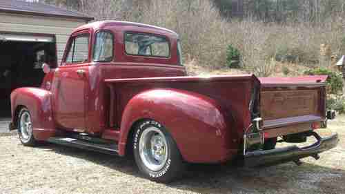 WE HAVE UP FOR AUCTION A VERY UNIQUE TRUCK.THE TRUCK IS A 1953 5 WINDOW CHEVY 3100.THE TRUCK HAS AROUND 1500 MILES SINCE THE MOTOR WAS BUILT.THE TRUCK ONLY HAD 60-70K ON IT.THIS TRUCK HAS NO RUST AND NEVER HAD ANY.UNDER THE HOOD THIS TRUCK HAS A 429 FORD ENGINE FROM A 68 MODEL.YES IT HAS A 68 429 FORD ENGINE!THIS ENGINE IS VERY STRONG AND RUNS FANTASTIC WITH A 770 DUAL LINE HOLLY CARB.THIS TRUCK HAS ALL NEW BRAKES AND LINES,ALL HOSES ARE NEW,NEW EXHAUST,PS ,TILT WHEEL.NEW 12 VOLT WIRING HARNESS,AND IGNITION ALSO ALL NEW!OK THE TRUCK SITS ON A LINCOLM MARK3 SUBFRAME,WITH A 9 INCH FORD REAREND.ALL GLASS AND RUBBER IS NEW!NEW PAINT AND THE INTERIOR IS NEW ALSO.ALL GAUGES AND INSTRUMENTS WERE SENT OFF AND CONVERTED TO 12 VOLT!OUTSIDE THIS TRUCK HAS NEW RALLY WHEELS AND CENTERS WITH ALMOST NEW TIRES!THE PICS DONT DO THIS TRUCK JUSTICE!THIS IS A FANTASTIC RUNNING AND DRIVING MACHINE!FOR INFORMATION PLEASE CALL:828-754-2327 OR 828-474-4241.
