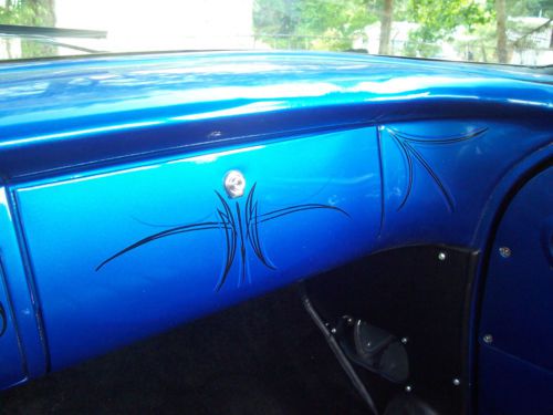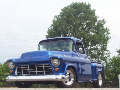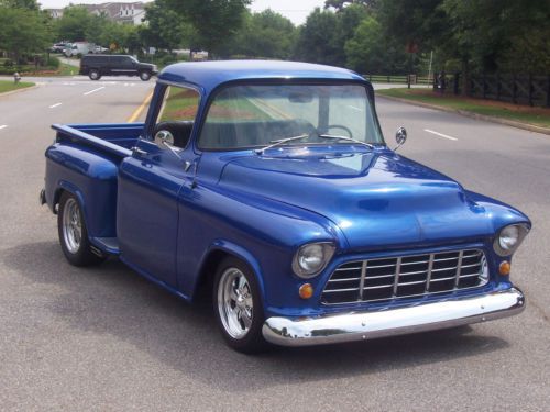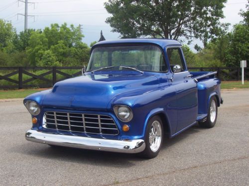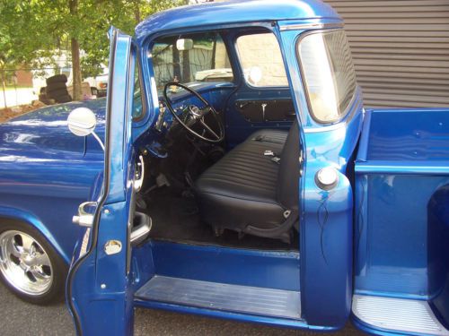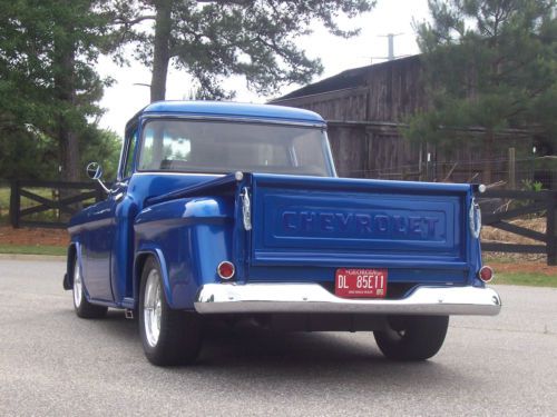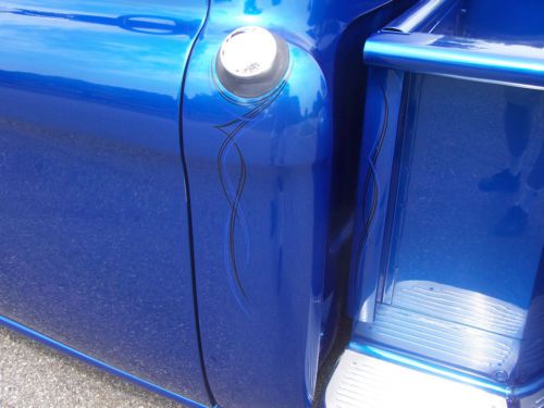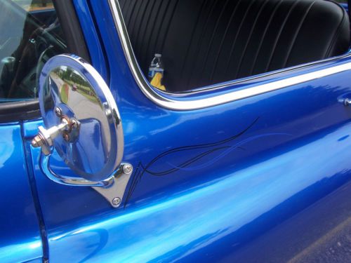 HAVE YOU BEEN SEARCHING FOR A HIGH QUALITY, FULLY RESTORED, CLASSIC BIG WINDOW CHEVY 3100 PICK UP? DO YOU REALLY WANT AN UPDATED FUEL INJECTED V8 MOTOR AND AUTOMATIC TRANSMISSION WITH OVERDRIVE THAT YOU CAN GET IN AND DRIVE? WOULD YOU LIKE TO HAVE POWER STEERING AND FRONT DISC BRAKES? ARE YOU LOOKING FOR ONE THAT HAS A KILLER STANCE, IS READY TO DRIVE AND ENJOY AND ALSO WILL TAKE HOME TROPHIES AT THE LOCAL SHOWS AND CRUISE-INS?? WELL, IF YOU HAVE BEEN SHAKING YOUR HEAD YES THEN GET COMFORTABLE BECAUSE THIS COULD BE THE CLASSIC HOT ROD TRUCK YOU HAVE BEEN SEARCHING FOR!!! It is hard to dispute the fact that 1950's Chevrolet Pick Up trucks that have been nicely upgraded are a hot category in todays Classic car and truck market. From 1955-1957 the Chevy trucks had a very similar style but the Big Window model is without a doubt the most sought after by collectors and truck builders. This particular Big Window '56 is believed to have been a California truck most if not all of its life and in 2004 was treated to a professional, full frame-off restoration, by a gentleman who was in the automotive business, to transform it in to a Modern Hot Rod Truck that could be driven, shown and enjoyed. I was able to speak directly to him recently to confirm what was done to this awesome truck. Originally he built a carbureted motor for it which he drove for a few years until he got the itch to do something different. He located a Vortech 4.8L Fuel injected motor that had 10 miles on it and had come from a 2006 Chevrolet truck that was damaged in transport to the dealership. He also got the original 4L60E Automatic overdrive transmission along with all of computer equipment and electronics. He put about 10,000 miles on the truck with the new drivetrain and about 2 years ago he traded it to another guy in California. The new owner made a few cosmetic changes and barely drove it putting only a few hundred miles on it during his ownership. A divorce forced him to let go of his toy which he had originally planned on keeping for many years. Unfortunate for him but lucky for the next owner....maybe you??? An appraisal was done on this truck back in 2008 after the new drivetrain had been installed and the appraisal came in at $51,000. We will include the appraisal report to the next owner. Prices on trucks of this quality have continued to appreciate but the lucky next owner will be able to buy this truck quite a bit lower then the 2008 Appraised value so they will know they are making a great investment!!! This is a truck that you can truly drive and enjoy as well as take to the shows and cruise-ins. It is actually the best driving 50's truck we have had and we have had some really nice trucks! You will surely fill the bed with trophies if that is what you enjoy. While not an absolute, over the top, trailer queen, it is, without a doubt, a very high quality build that I doubt you could duplicate for the price you can buy it for. Even better is knowing that it is a great investment in something you and your family can drive and enjoy, not just ready quarterly reports about. I will do my best to provide enough large images, a video of it starting up and running, and an honest description to help you decide if this is the one you have been dreaming of. As you will see in the pics that follow, the body on this '56 is in fantastic condition and the Bright Blue Metallic paint glistens. However, it was an overcast day when many of the pics were taken so I can honestly say the paint color pops even more in person then it does in the pictures. I have seen pictures of the truck before the restoration and it started out as a super solid, close to rust free truck before the frame off restoration. This truck is all steel!!! Body panels are very straight and line up very nicely. It was painted about 10 years ago and had accumulated quite a few chips from normal driving. We decided it deserved a fresh coat of paint which we had done about a month ago in the same color and it looks awesome. The wood in the bed had also dried out from the years of use and California sun so we had the wood bed refinished and it also looks awesome. Chrome, trim and glass all looks excellent!! Front windows were changed out to the one piece windows which look great. As you will see this truck has an awesome Hot Rod stance and the body style will take you back to the good 'ol days. Enough talk....I will let the pics of the body tell you the story. While there is no doubt that the Royal Blue Metallic paint on this Big Window '56 is jaw-dropping gorgeous, we also felt it needed just a little something extra. A phone call to Larry Conway at Conway's Custom Pin Striping was all it needed. Larry came out and layed down some awesome custom pin stripe art. It is suddle enough that it does not jump out at you but I think you will agree that it really highlights the beauty of the body lines of this truck and will help this truck stand apart form the others at the shows. Check out some of the pin striping in the pictures below. He also continued the same theme on the interior which you can see in the interior pics later on. The retro, yet upgraded look continues on the interior of this awesome '56 with a stock style front seat that was custom done in a rich black leather on the seat bottom and a matching synthetic seat back. This gives you all the comfort of leather plus added durability and comfort. There is also plenty of room in the cab of this '56 since the original fuel tank that is normally mounted behind the seat was removed and a larger fuel tank was relocated under the wood bed. This enabled the bench seat to be repositioned further back so even the taller crowd will fit comfortably in this Hot rod. As you will see this '56 has a stock original steering wheel mounted on a tilt column. It is a blast to drive with the original wheel!! An updated set of gauges were installed in the stock chrome gauge bezel and an additional tach was neatly installed in 