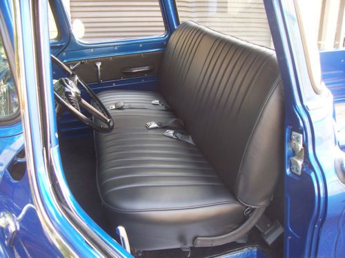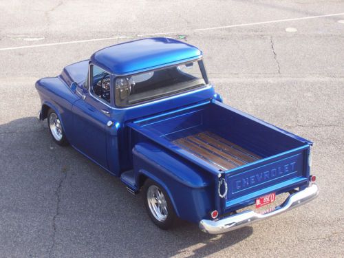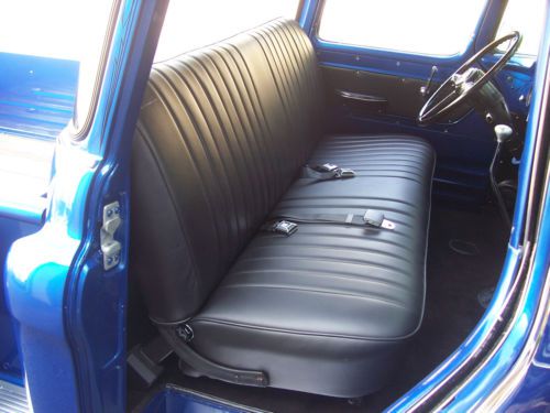 HAVE YOU BEEN SEARCHING FOR A HIGH QUALITY, FULLY RESTORED, CLASSIC BIG WINDOW CHEVY 3100 PICK UP? DO YOU REALLY WANT AN UPDATED FUEL INJECTED V8 MOTOR AND AUTOMATIC TRANSMISSION WITH OVERDRIVE THAT YOU CAN GET IN AND DRIVE? WOULD YOU LIKE TO HAVE POWER STEERING AND FRONT DISC BRAKES? ARE YOU LOOKING FOR ONE THAT HAS A KILLER STANCE, IS READY TO DRIVE AND ENJOY AND ALSO WILL TAKE HOME TROPHIES AT THE LOCAL SHOWS AND CRUISE-INS?? WELL, IF YOU HAVE BEEN SHAKING YOUR HEAD YES THEN GET COMFORTABLE BECAUSE THIS COULD BE THE CLASSIC HOT ROD TRUCK YOU HAVE BEEN SEARCHING FOR!!! It is hard to dispute the fact that 1950's Chevrolet Pick Up trucks that have been nicely upgraded are a hot category in todays Classic car and truck market. From 1955-1957 the Chevy trucks had a very similar style but the Big Window model is without a doubt the most sought after by collectors and truck builders. This particular Big Window '56 is believed to have been a California truck most if not all of its life and in 2004 was treated to a professional, full frame-off restoration, by a gentleman who was in the automotive business, to transform it in to a Modern Hot Rod Truck that could be driven, shown and enjoyed. I was able to speak directly to him recently to confirm what was done to this awesome truck. Originally he built a carbureted motor for it which he drove for a few years until he got the itch to do something different. He located a Vortech 4.8L Fuel injected motor that had 10 miles on it and had come from a 2006 Chevrolet truck that was damaged in transport to the dealership. He also got the original 4L60E Automatic overdrive transmission along with all of computer equipment and electronics. He put about 10,000 miles on the truck with the new drivetrain and about 2 years ago he traded it to another guy in California. The new owner made a few cosmetic changes and barely drove it putting only a few hundred miles on it during his ownership. A divorce forced him to let go of his toy which he had originally planned on keeping for many years. Unfortunate for him but lucky for the next owner....maybe you??? An appraisal was done on this truck back in 2008 after the new drivetrain had been installed and the appraisal came in at $51,000. We will include the appraisal report to the next owner. Prices on trucks of this quality have continued to appreciate but the lucky next owner will be able to buy this truck quite a bit lower then the 2008 Appraised value so they will know they are making a great investment!!! This is a truck that you can truly drive and enjoy as well as take to the shows and cruise-ins. It is actually the best driving 50's truck we have had and we have had some really nice trucks! You will surely fill the bed with trophies if that is what you enjoy. While not an absolute, over the top, trailer queen, it is, without a doubt, a very high quality build that I doubt you could duplicate for the price you can buy it for. Even better is knowing that it is a great investment in something you and your family can drive and enjoy, not just ready quarterly reports about. I will do my best to provide enough large images, a video of it starting up and running, and an honest description to help you decide if this is the one you have been dreaming of. As you will see in the pics that follow, the body on this '56 is in fantastic condition and the Bright Blue Metallic paint glistens. However, it was an overcast day when many of the pics were taken so I can honestly say the paint color pops even more in person then it does in the pictures. I have seen pictures of the truck before the restoration and it started out as a super solid, close to rust free truck before the frame off restoration. This truck is all steel!!! Body panels are very straight and line up very nicely. It was painted about 10 years ago and had accumulated quite a few chips from normal driving. We decided it deserved a fresh coat of paint which we had done about a month ago in the same color and it looks awesome. The wood in the bed had also dried out from the years of use and California sun so we had the wood bed refinished and it also looks awesome. Chrome, trim and glass all looks excellent!! Front windows were changed out to the one piece windows which look great. As you will see this truck has an awesome Hot Rod stance and the body style will take you back to the good 'ol days. Enough talk....I will let the pics of the body tell you the story. While there is no doubt that the Royal Blue Metallic paint on this Big Window '56 is jaw-dropping gorgeous, we also felt it needed just a little something extra. A phone call to Larry Conway at Conway's Custom Pin Striping was all it needed. Larry came out and layed down some awesome custom pin stripe art. It is suddle enough that it does not jump out at you but I think you will agree that it really highlights the beauty of the body lines of this truck and will help this truck stand apart form the others at the shows. Check out some of the pin striping in the pictures below. He also continued the same theme on the interior which you can see in the interior pics later on. The retro, yet upgraded look continues on the interior of this awesome '56 with a stock style front seat that was custom done in a rich black leather on the seat bottom and a matching synthetic seat back. This gives you all the comfort of leather plus added durability and comfort. There is also plenty of room in the cab of this '56 since the original fuel tank that is normally mounted behind the seat was removed and a larger fuel tank was relocated under the wood bed. This enabled the bench seat to be repositioned further back so even the taller crowd will fit comfortably in this Hot rod. As you will see this '56 has a stock original steering wheel mounted on a tilt column. It is a blast to drive with the original wheel!! An updated set of gauges were installed in the stock chrome gauge bezel and an additional tach was neatly installed in 
