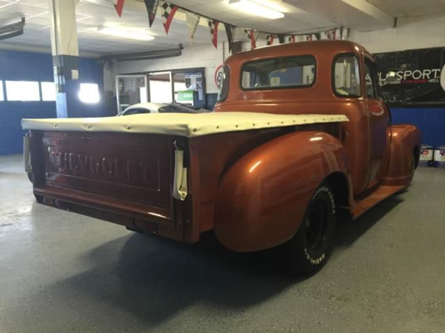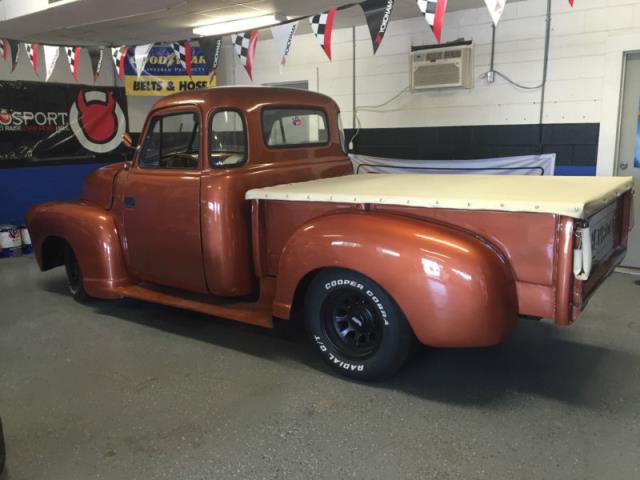 Nice custom 1952 Chevy 3100 5 window has brand new cream colored interior, new tan carpet in cab and bed, a custom tonneau cover that matches the seat and headliner. This truck also has new weather stripping and door glass along with the two smaller cab windows. Truck is sitting on a S10 frame with a freshly built detailed 350 backed by a 700r4 trans. The truck has no rust anywhere and runs, drive and stops GREAT! was built to cruise and be comfortable (somthing you can drive to shows and cruise-ins in). It has upgraded s10 discs in the front with the original s10 drums in the back. Paint looks very good and I would rate a 7-10 as it does have some rock chips and a blemish here and there, but again this truck was built to be driven. Body was modified with suicide doors and the original steps have been replaced with wooden running boards.