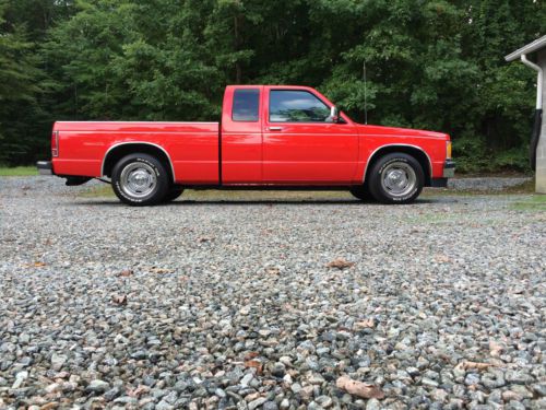 1991 Chevy S10 Lowered Extended Cab 4.3 power windows, brakes, steering and a/c, bucket seats This little red S10 was completely redone 2011 including new paint materials alone $2000., Jasper rebuilt engine , transmission was bebuilt. New radiator, brakes, sensors, computer, hoses, belt, dash cover, carpet, windshield, mirrors, bed mat, bumper covers. New tires, Corvette 8x15 Ralley wheels, New GMC Cyclone grill with Chevy bowtie emblem, New Pioneer radio and speakers, New taillights, New upper control arms ball joints and alignment in July 2014. It has been driven less than 5,000 miles since redone runs and drives great the only item not working is the odometer, this vehicle has been garage kept since completion.