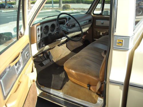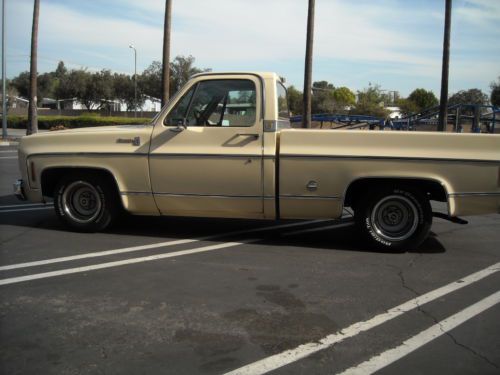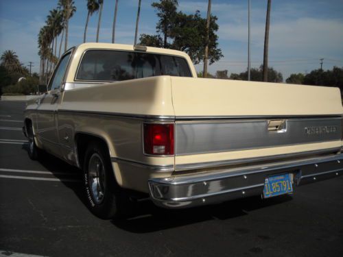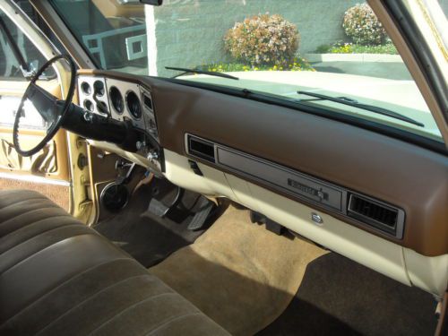UP FOR BID AND SALE IS MY CHEVROLET SILVERADO FACTORY 454 (7.4) SHORTBED . FACTORY COLOR IS SANTA FE TAN. THE TRUCK IS A TRUE BIG-BLOCK SHORT BED. IT IS NOT A SHOW TRUCK OR GARAGE QUEEN, BUT A CARED FOR EVERYDAY DRIVER. I AM THE THIRD OWNER AND HAVE OWNED IT JUST UNDER 7-9 YEARS OR SO? IT HAS ITS ORIGINAL PAINT ON THE HOOD AND ENTIRE CAB, LEFT FENDER AND BED AND AND TAILGATE. PRYOR TO ME THE R/S FENDER WAS REPLACED ALONG W/THE FRONT BUMPER. ABOVE THE REAR UPPER MLDGS ON THE BED THERE WAS SOME PAINT WORK DONE AS WELL. CALIFORNIA TRUCK FROM NEW , NO VISABLE RUST ALL PAINT SEEMS TO BLEND WELL AND LOOKS GOOD' THE INSIDE WAS REDONE AT SOME POINT AND IS WARM AND WORKS. INSIDE OF BED HAS OLD BEDLINER AND THE PAINT UNDERNEATH IS OLD AND SHOWS SURFACE RUST AND IS UGLY. SO I LEFT THE LINER IN IT SO I COULD USE IT AS A TRUCK' IT STILL HAS THE MANIFEST RPO LABEL ON THE INSIDE OF THE GLOVEBOX SHOWING THE MANY OPTIONS IT HAS' AC,7.4 ENG,POWER WDOS, TILT STEERING,TACH, ECT. ORIGINAL ENG W/ CALIF EMISSION SYSTEM. THINGS THAT DON'T WORK: TACH-INOP, NON FACT RADIO,CRUISE CNRTL (MISSING PARTS) FACT.SEAT/BELTS (MISSING) HORN (CONTACT IN S/W) I DID LOWER IT AS YOU CAN TELL, REAR SPRINGS WERE DE-ARCHED HELPER SPRINGS REMOVED, FRONT HAD SHOCKS AND SPRINGS REPLACED AND IT RIDES REAL SMOOTH AND NICE. DRIVE TRAIN IS STOCK 454 W TH400 TRANS RUNS WELL NOTHING SPECIAL 4BBL QJET I ONLY DRIVE IT ON WEEKENDS MAINLY, DUE TO GAS HERE IN SO CAL@ $4.25-4.95 PER GAL. AT ANY GIVEN TIME' SO IT NEEDS A NEW HOME. EMAIL IF YOU HAVE ANY ?S AND THANKS FOR LOOKING..........